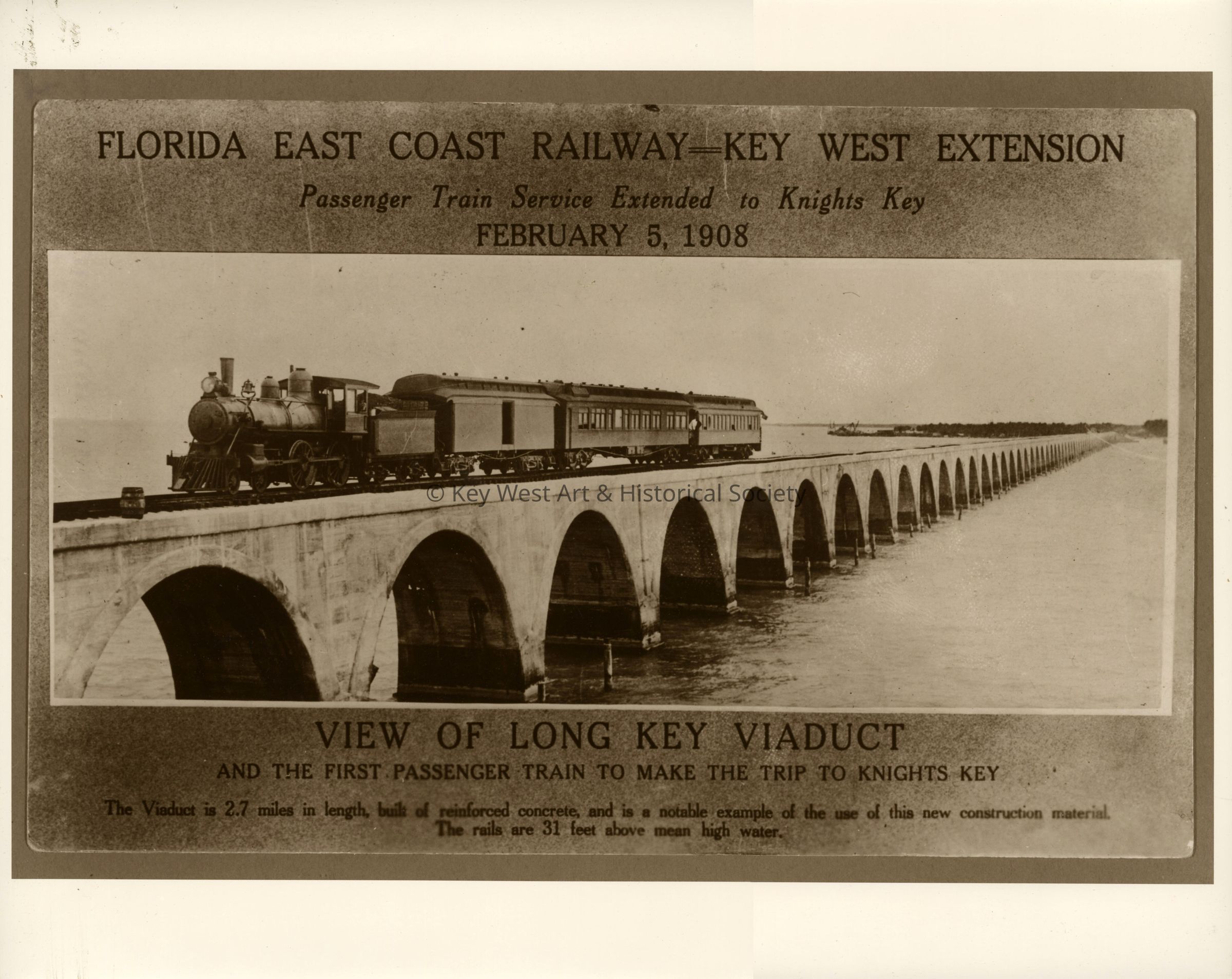 Black and white photograph a Florida East Coast Railway train on Long Key Bridge. Caption reads, 'Florida East Coast Railway - Key West Extension. Passenger Train Service Extended to Knights Key February 5, 1908. View of Long Key Viaduct and the First Passenger Train to make the trip to Knights Key. The viaduct is 2.7 miles in length, built of reinforced concrete, and is a notable example of the use of this new construction material. The rails are 31 feet above mean high water.'Photograph Details