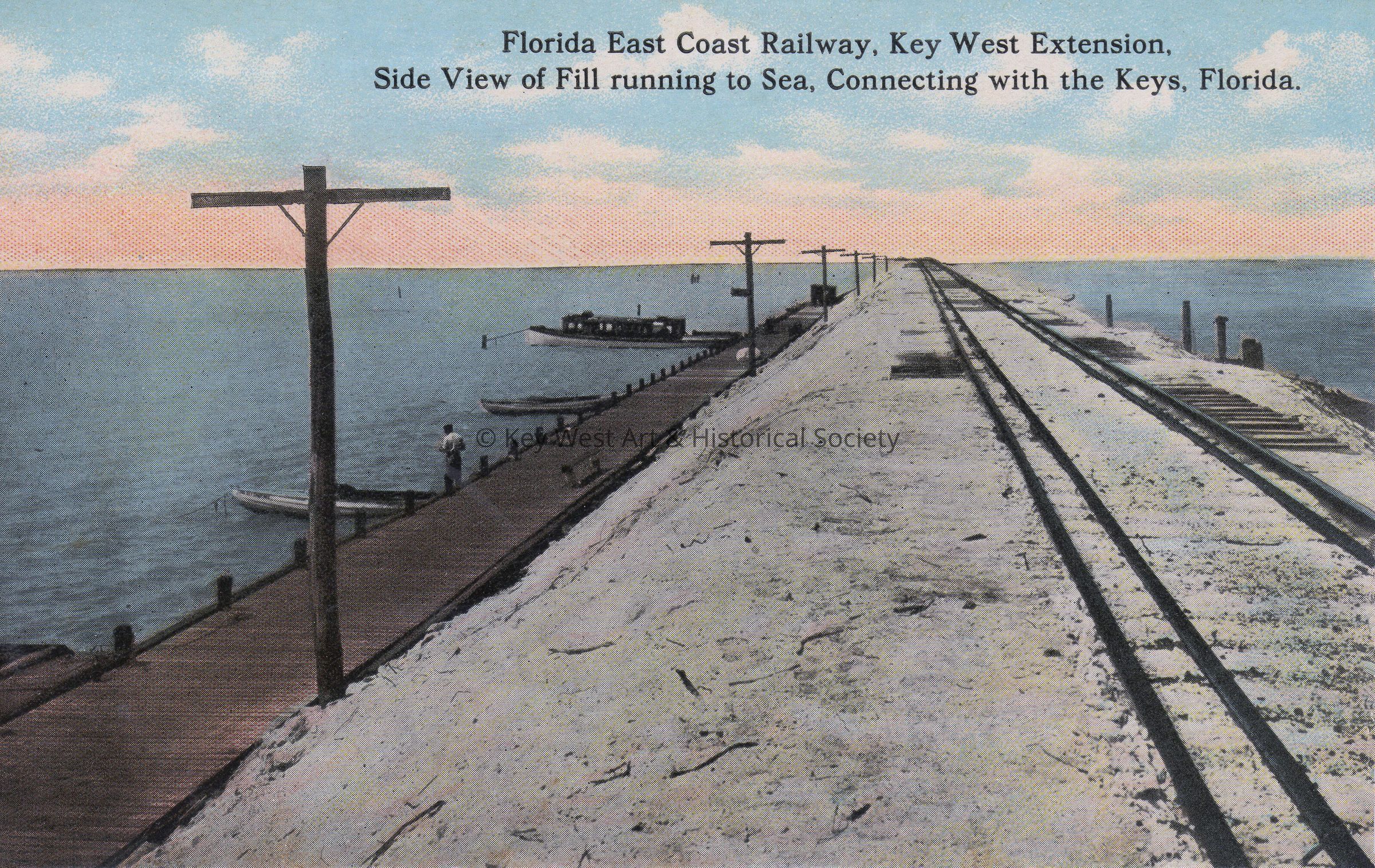 Postcard depicting railroad tracks near a pier on the ocean. The caption reads, ‘Florida East Coast Railway Key West Extension, side view of fill running to sea, connecting with the Keys Florida’.Collection