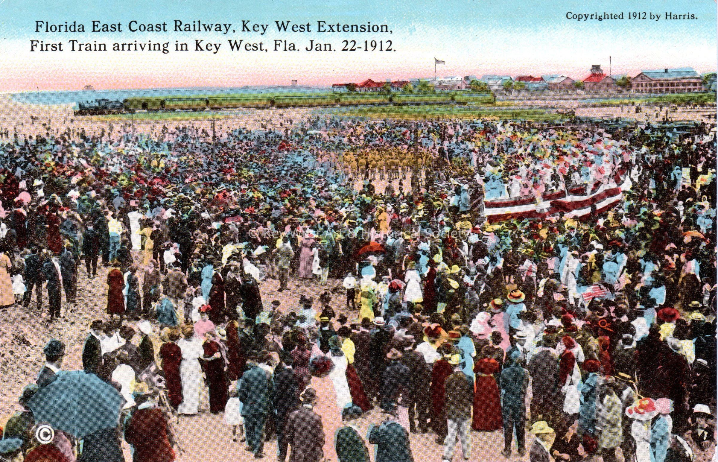 Postcard depicting overhead view of a crowd near a train. The caption reads, ‘Florida East Coast Railway, Key West, Extension first train arriving in Key West, Florida, January 22nd, 1912’. In line of arrival: Engine 48, baggage car 14, Detroit 92, Alicia 90, Rambler 91, Louisville M.C. Walters, Open Observation 1.Subject Person/Organization