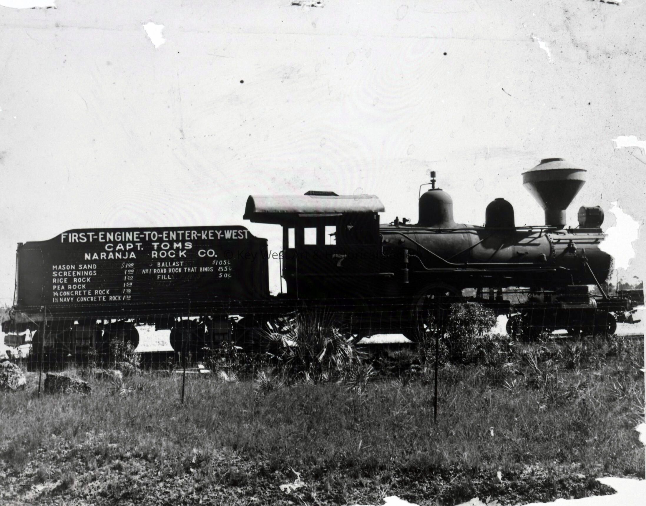 Black and white negative of the Florida East Coast Railway engine that first arrived in Key West in 1912. It was later used as a marketing tool for Captain Tom's Naranja Rock Company.