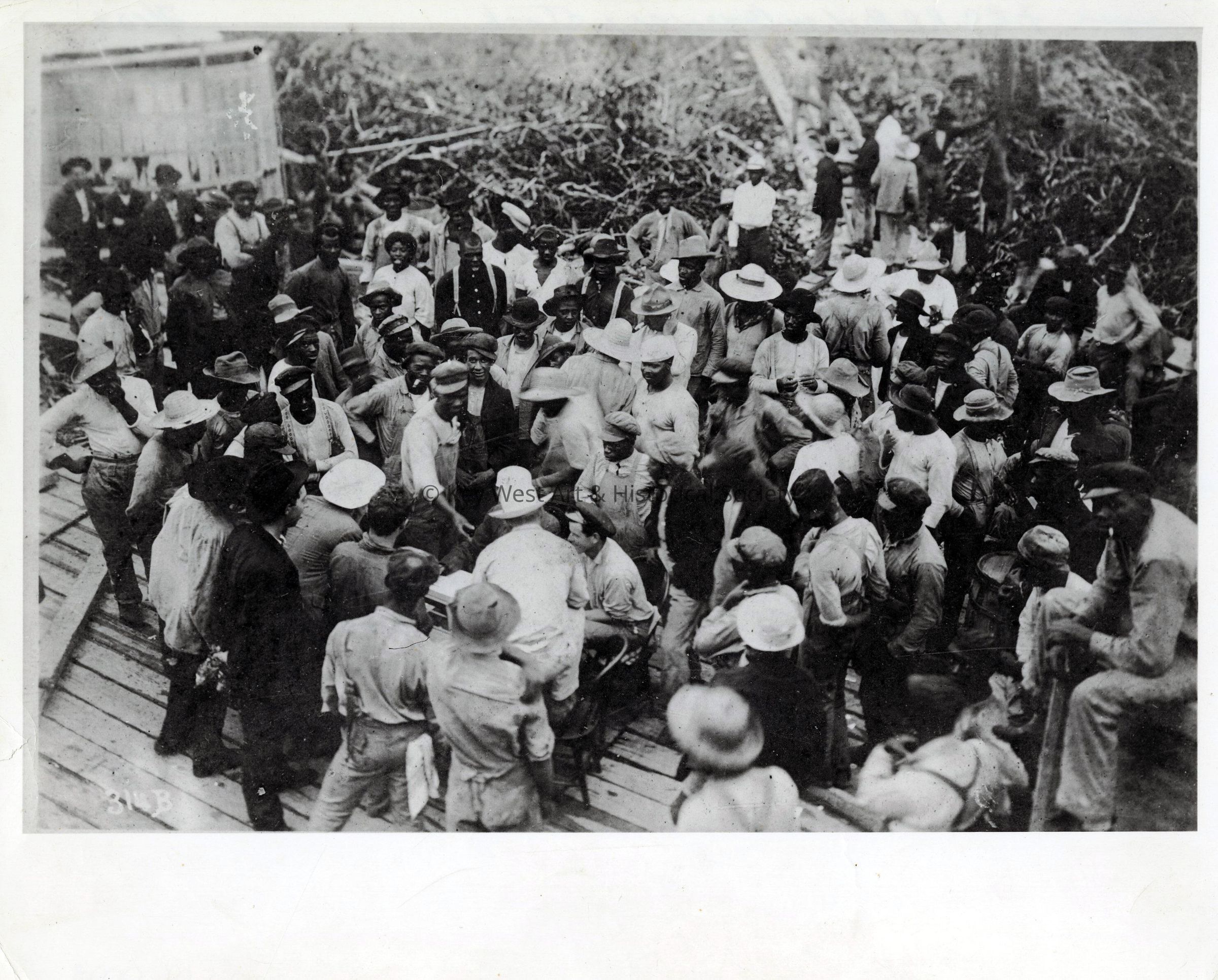 Black and white photograph of paymaster F.A. Barrett holding pay day for a large number of workers at Camp No. 2 on Plantation Key belonging to the Florida East Coast Railway.