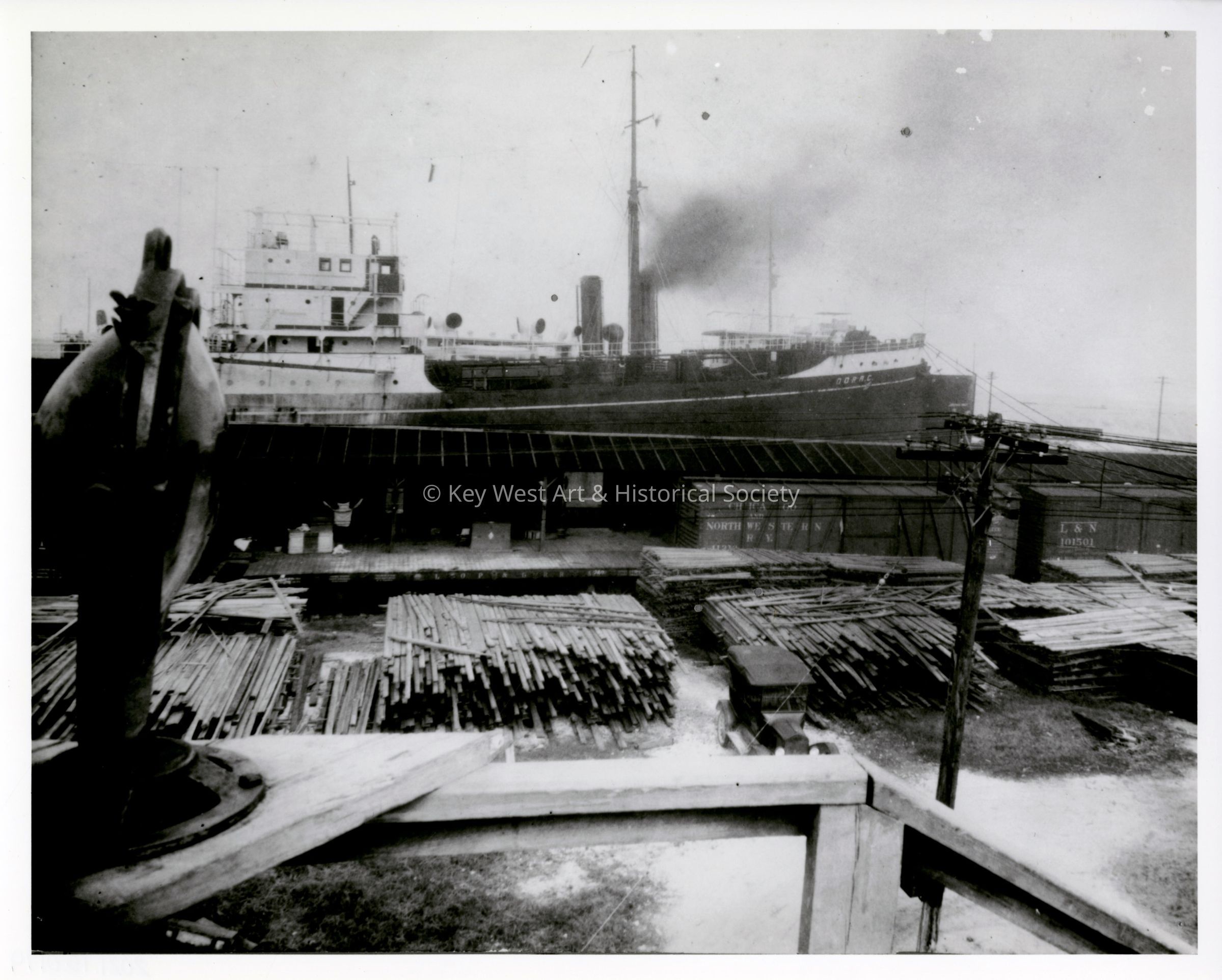 Black and white photograph of a Florida East Coast Railway train and steamship docked at the Key West depot at Trumbo Point.