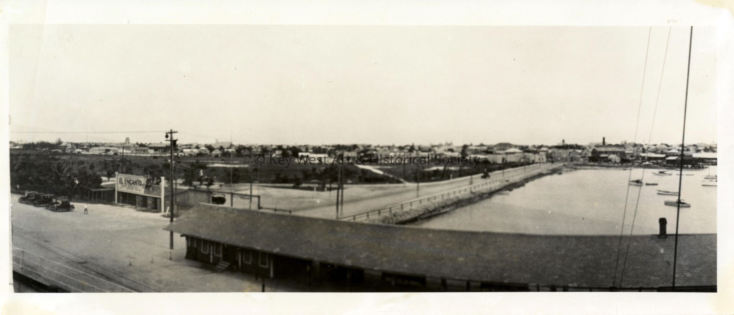 Black and white photograph of the Florida East Coast Railway train depot at Trumbo Point.