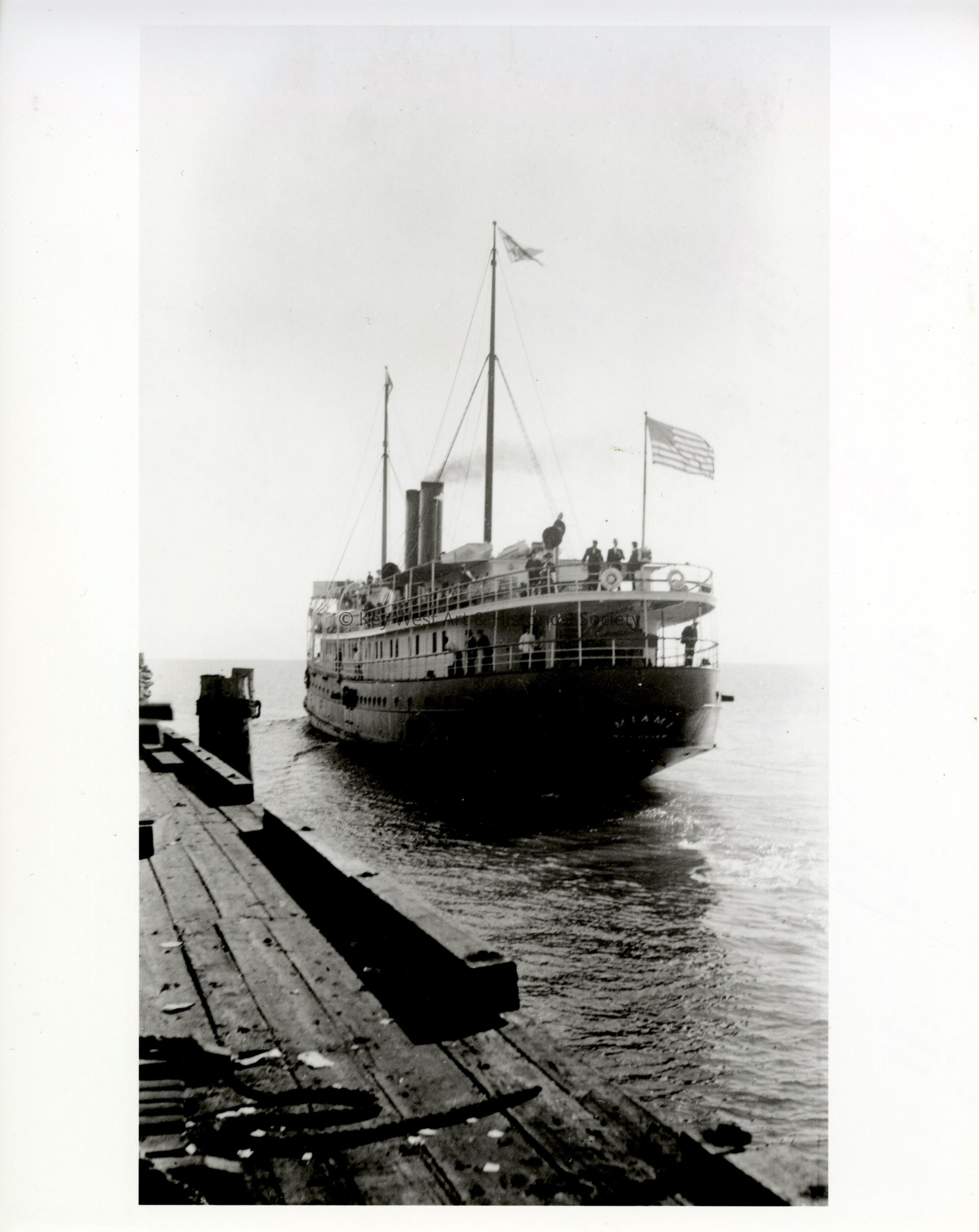 Black and white photograph of a Florida East Coast Railway train alongside the P&O steamship 'Cuba' at the Key West train depot at Trumbo Point.