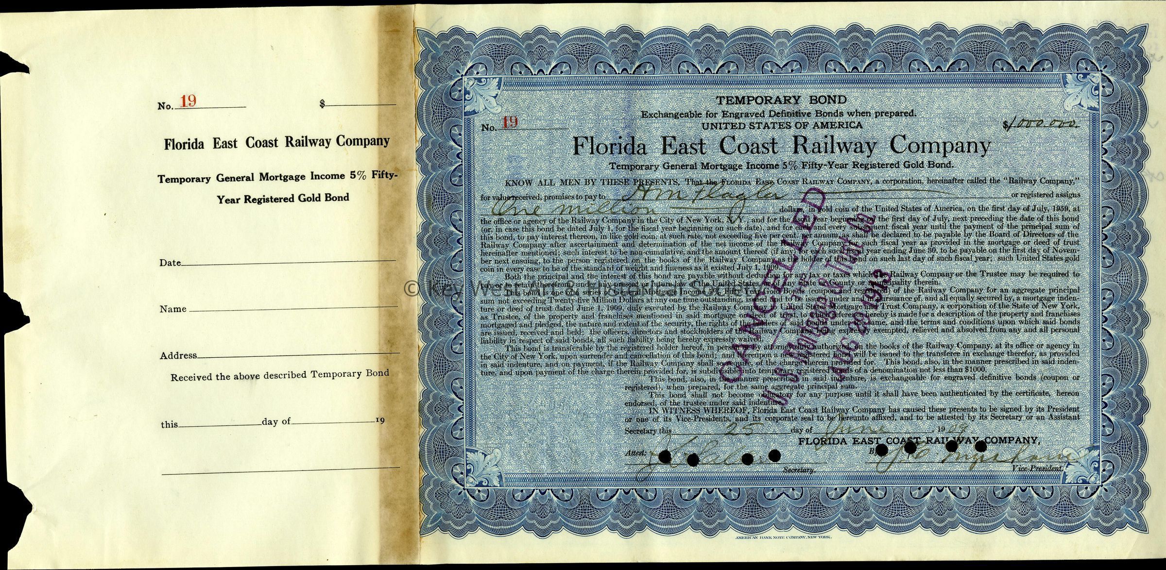 Florida East Coast Railway Company $1,000,000 temporary bond issued to Henry M. Flagler on June 25, 1909. This is bond number 19, on the back of the bond it records the interest payment made to Flagler in 1910, 1911, and 1912. After Flagler's death in May 1913, his trustees William Beardsley, William Kenan Jr. and Joseph Parrott took over the bond on August 14, 1913.Collection