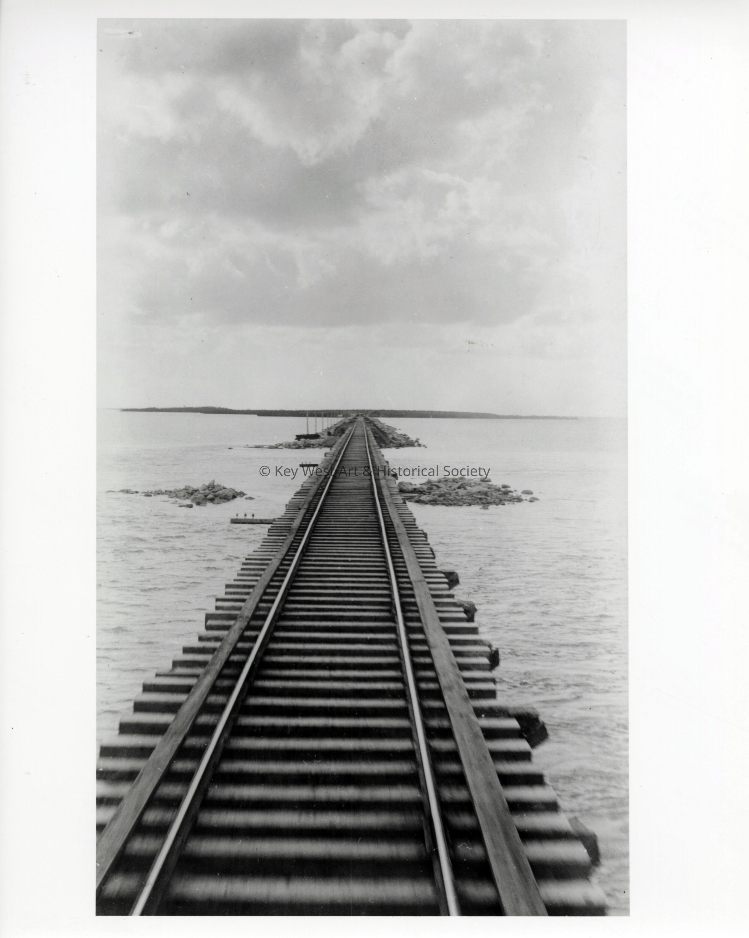 Black and white photograph of Florida East Coast Railway train tracks, possibly heading toward Key Largo.