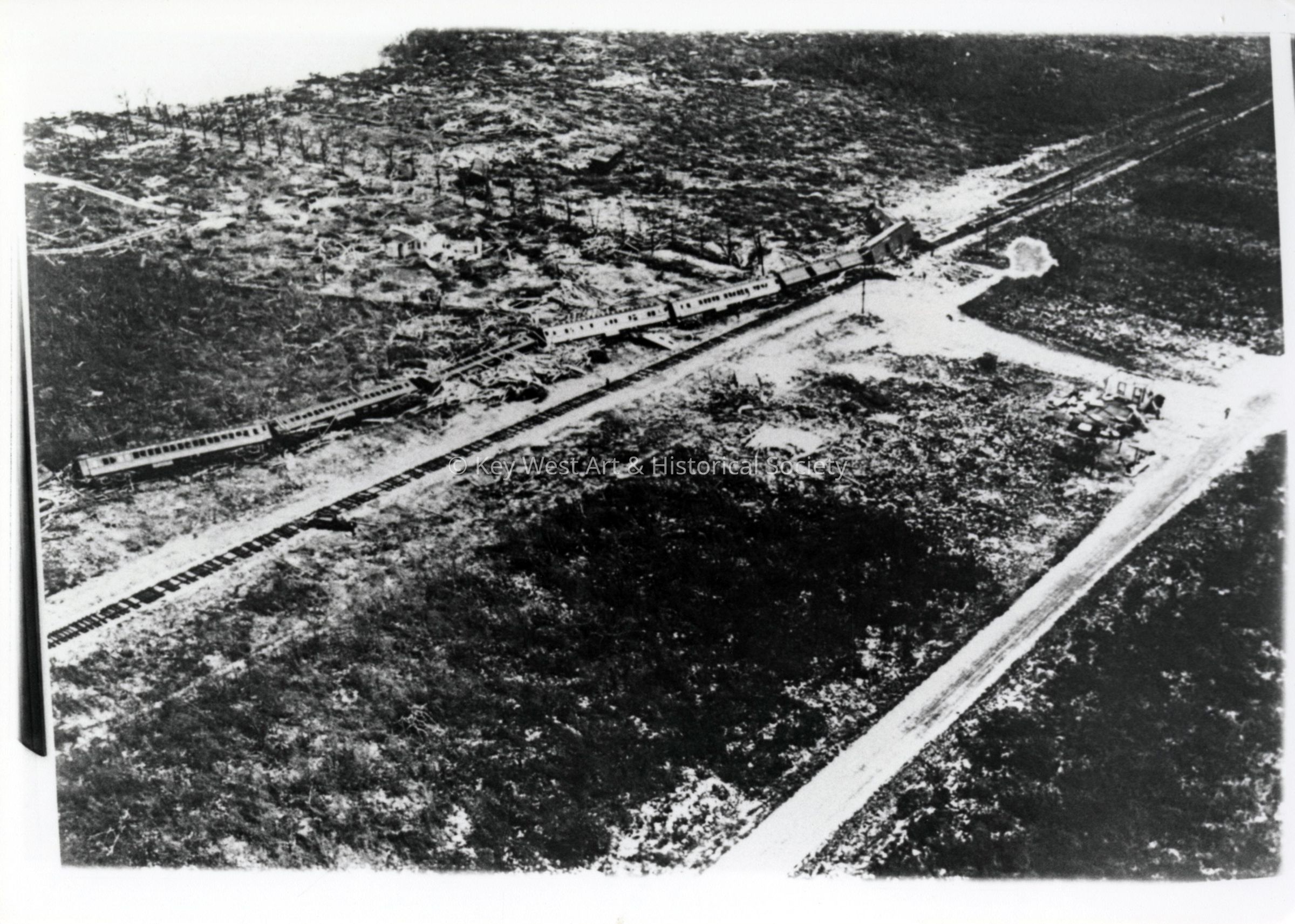 Black and white photograph of the Florida East Coast Railway train blown off the tracks by the Labor Day Hurricane near Islamorada. Caption on verso, 'Upper Matecumbe Key after the hurricane that struck on Labor Day, 1935. This view is looking from the south, and shows the wreckage of the train sent to rescue the veterans. At the extreme right is a man standing on the highway. To his left are the remains of the store that served as the Islamorada Post Office. The train station stood at the intersection of the road/tracks. The ruins of a house stand above the train.'Photograph Details