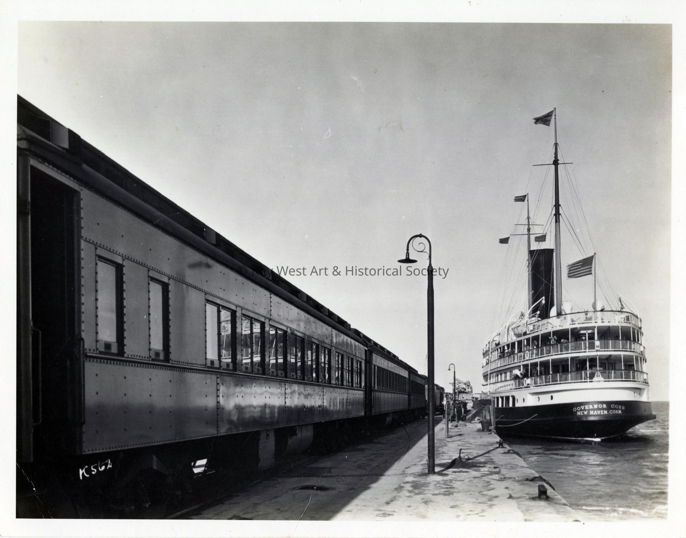 Black and white photograph of a Florida East Coast Railway train alongside the P&O ferry 'Governor Cobb' at the Key West train depot at Trumbo Point.