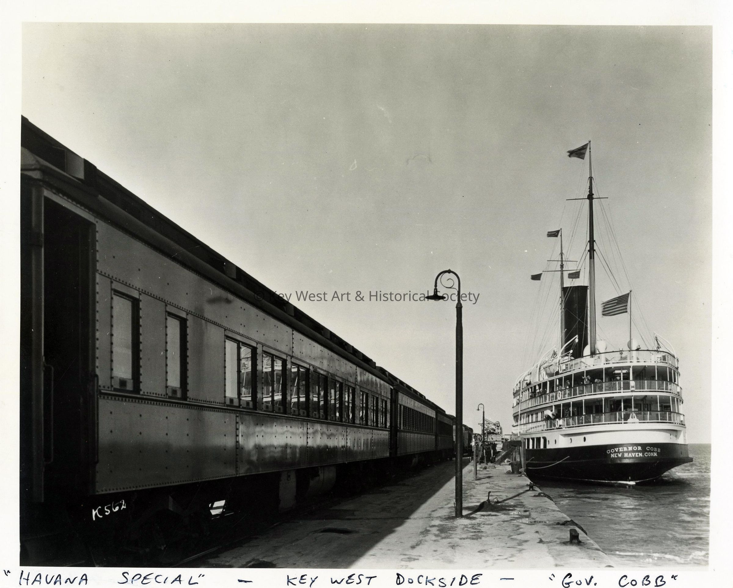 Black and white photograph of a Florida East Coast Railway passenger train at the depot on pier one at Trumbo Point with the steamship 'Governor Cobb' alongside.