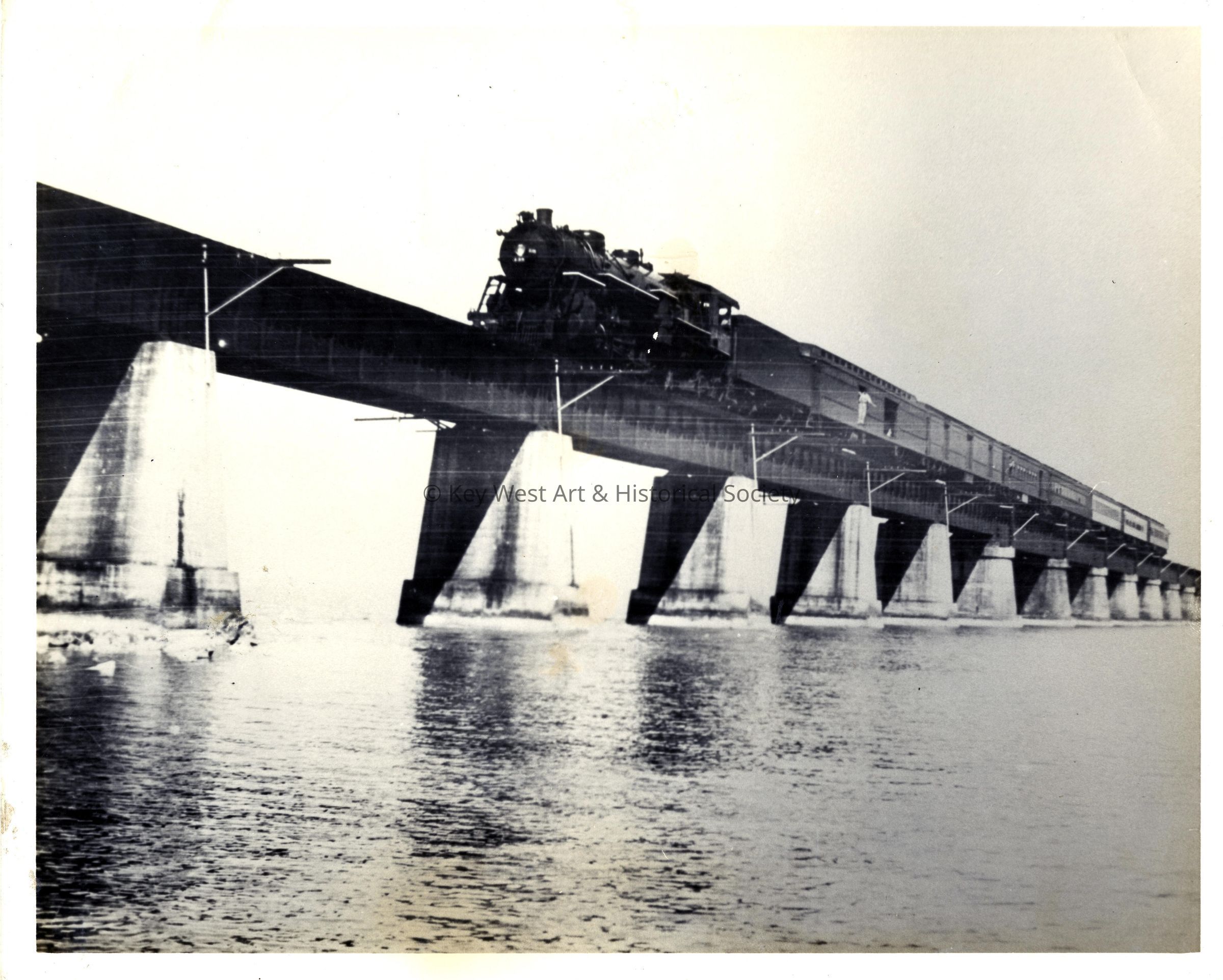 Black and white photograph of a Florida East Coast Railway train crossing the Seven Mile Bridge as viewed from Pigeon Key.