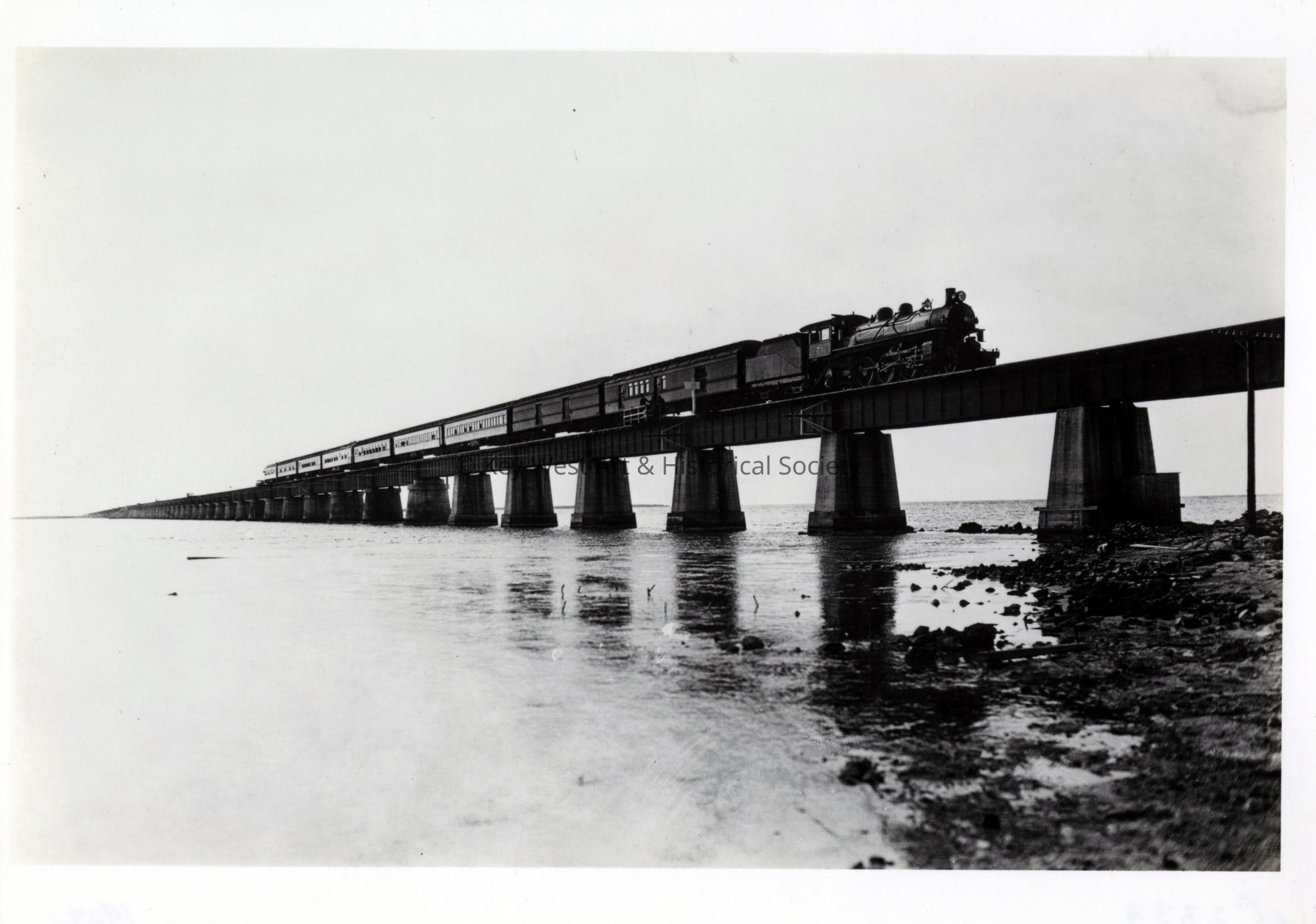 Black and white photograph of a Florida East Coast Railway train, led by locomotive No.71, crossing the Seven Mile Bridge taken from Pigeon Key.