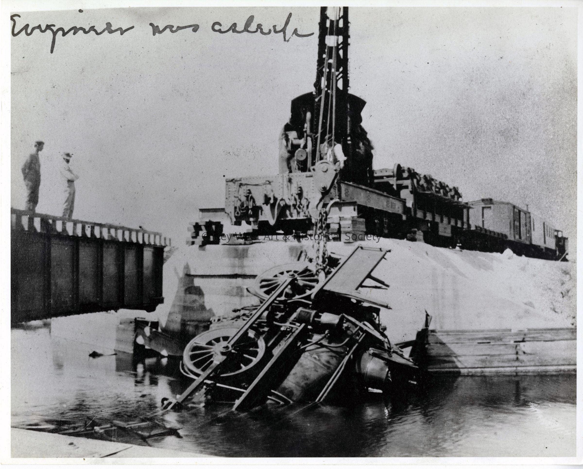 Black and white photograph of Florida East Coast Railway train wreck that has fallen from a bridge. Men standing in front of the wrecked locomotive. Caption on photograph, 'Engineer was asleep'.