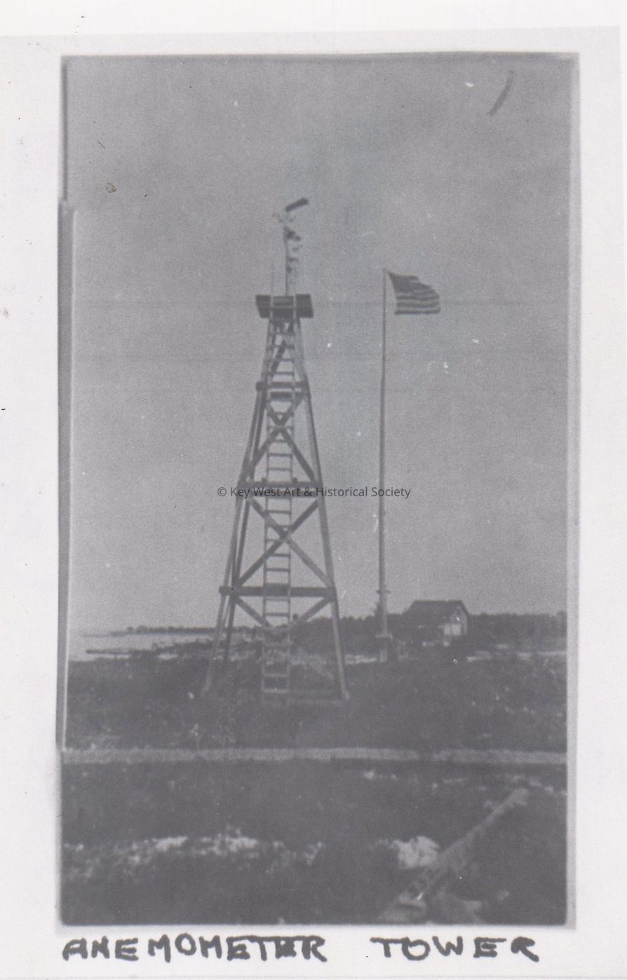 Black and white photograph of the Florida East Coast Railway's weather tower in Marathon. C.J. Corless is standing on the observation platform and the Marathon Boardwalk is visible in the foreground.