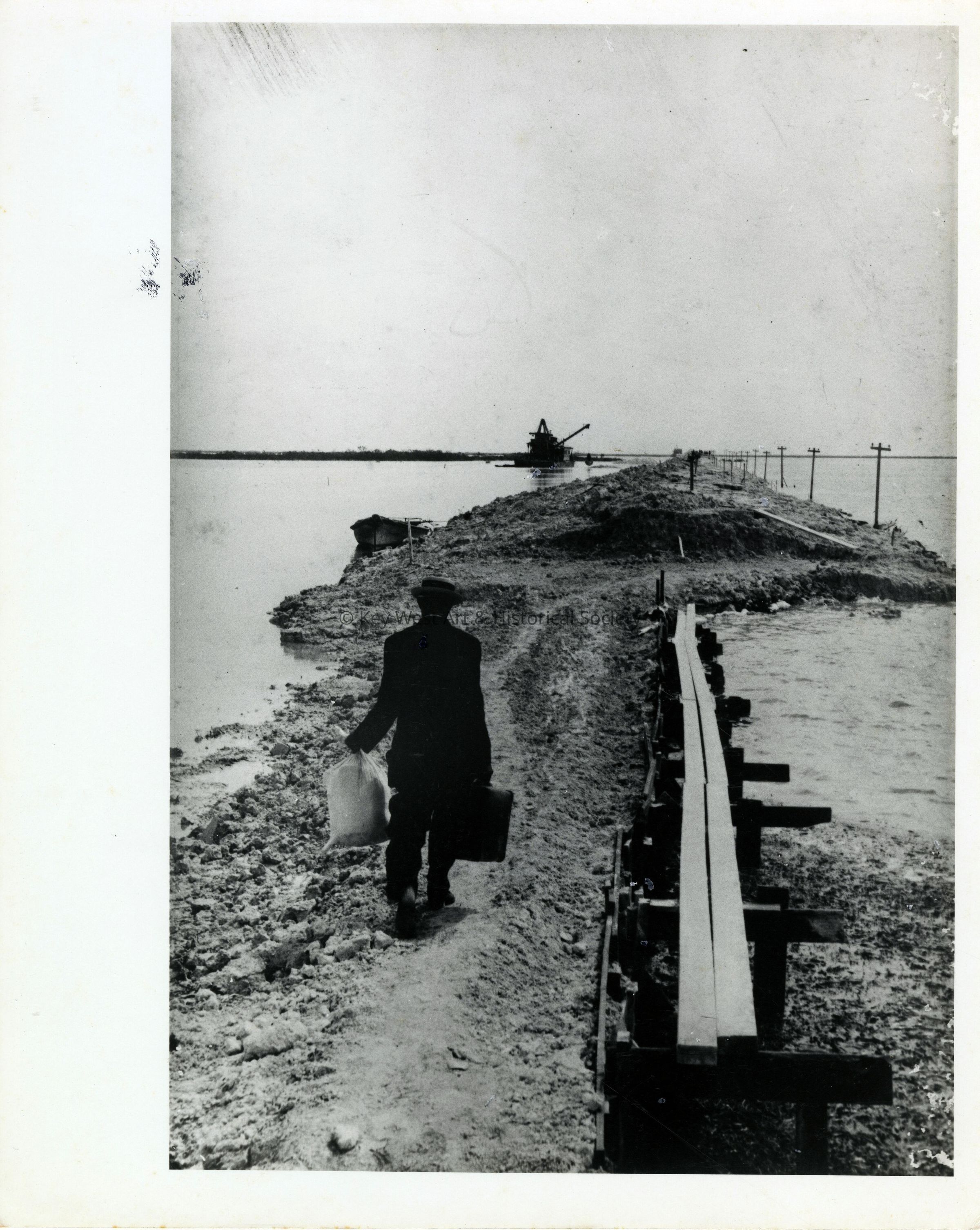 Black and white photograph of a Florida East Coast Railway construction worker leaving camp for a weekend off.