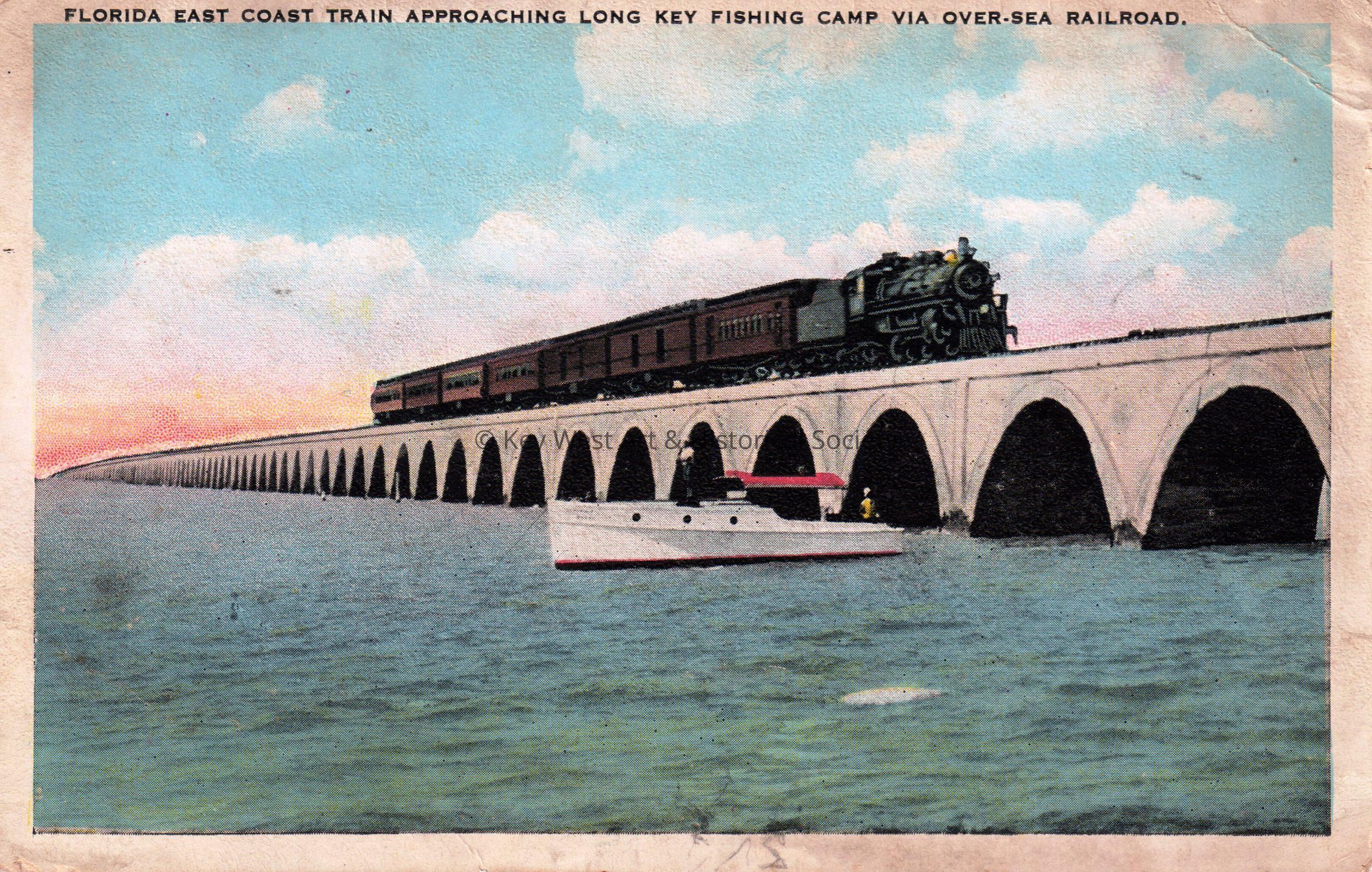 Postcard depicting a Florida East Coast Railway train crossing Long Key Bridge. The caption reads, ‘Florida East Coast train approaching Long Key fishing camp via over sea railroad’.Subject Person/Organization