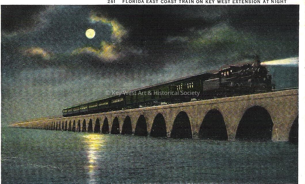 Postcard of the "Florida East COast Train on Key West Extension at Night".Subject Place