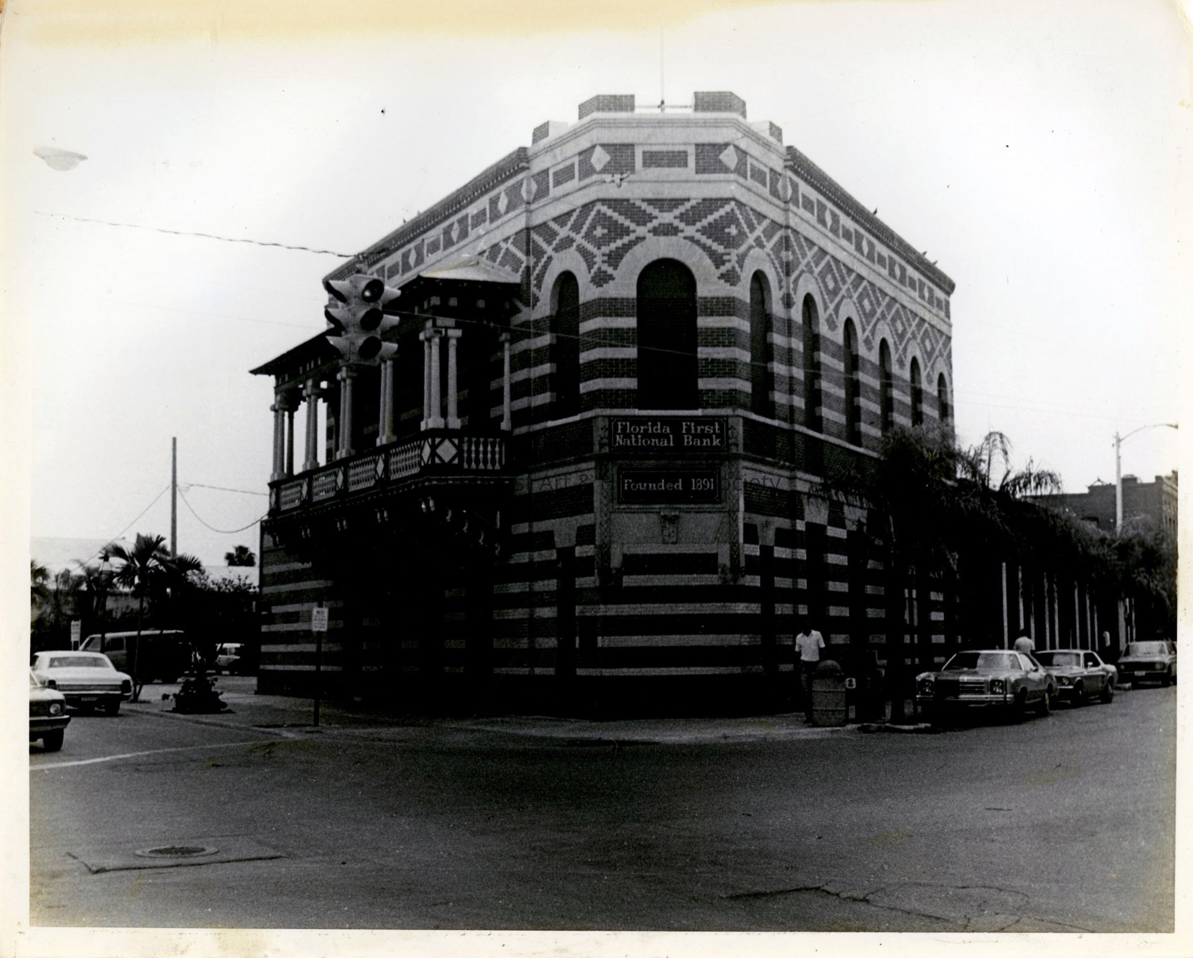 Black and white photograph of the Florida First National Bank at the corner of Front and Duval streets.