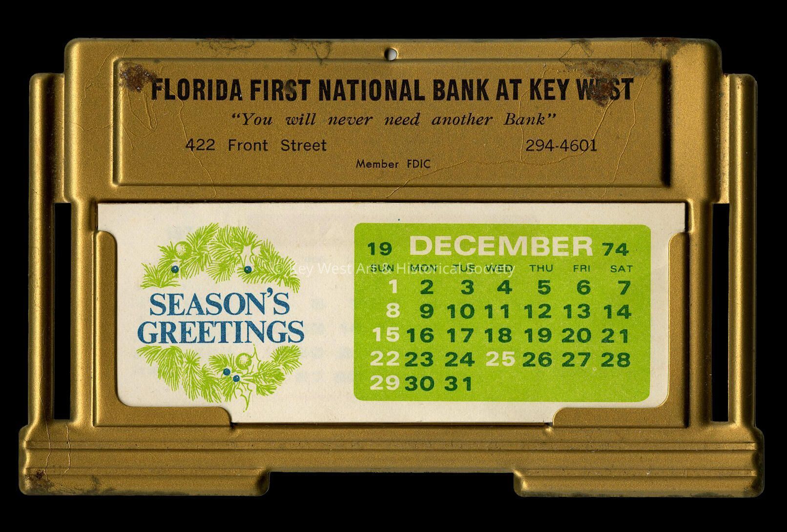 A small desktop calendar for the year 1975 given to customers of Florida First National Bank at Key West, located at 422 Front Street.Collection