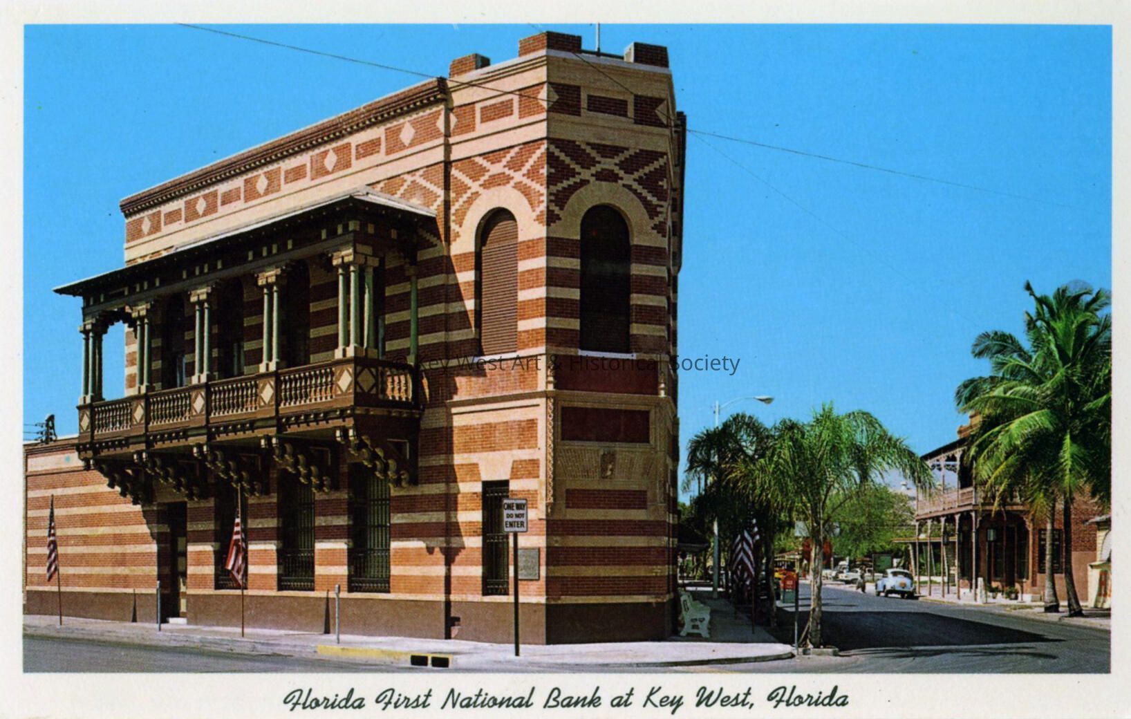 Postcard depicting a triangle-shaped, red and white striped brick building at 100 Duval Street. The caption reads, ‘Florida First National Bank at Key West, Florida’. Notation on verso, 'Florida First National Bank at Key West, Florida. Key West's oldest bank with its distinctive Spanish style balcony lies at the entrance to Front Street, near recently restored Old Mallory Square. It is only a block from the north end of Duval Street where clipper ships and schooners docked in Key West's trading and wrecking days and where Naval vessels may be seen now. In the background are other old buildings of Front Street recently restored. Front Street was once lined with brokerage and commission houses serving the sailing ship trade.'Subject Place