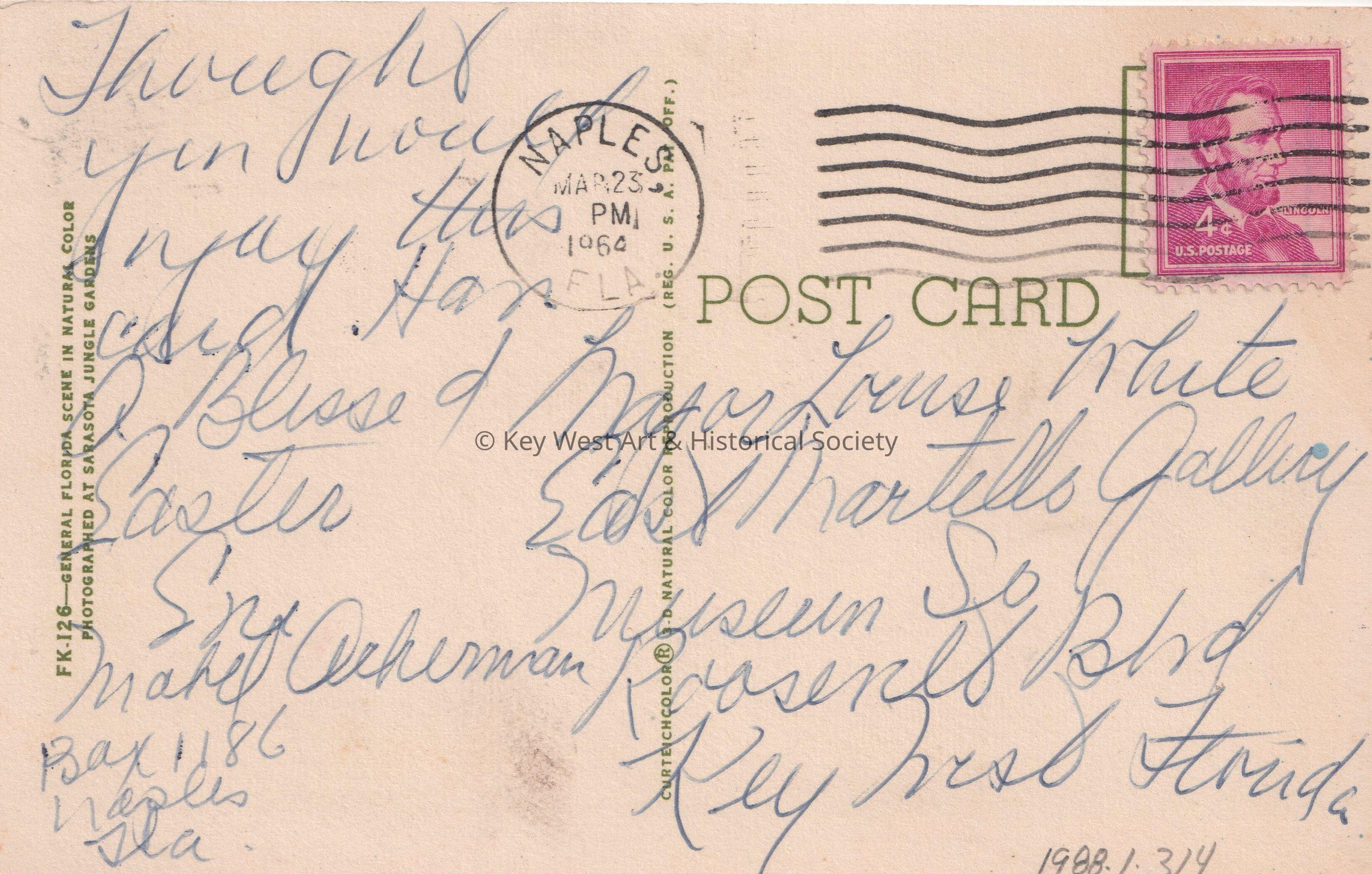 Postcard of a sign amidst foliage that reads, ‘The kiss of the Sun for pardon; The song of the birds for mirth; You’re nearer God’s heart in a garden, Than anywhere else on earth…’ The caption reads, ‘Florida Greetings’. The description on the verso reads, ‘General Florida scene in natural color. Photographed at Sarasota Jungle Gardens.’ The message on the verso reads, ‘Thought you would enjoy this card. Have a blessed Easter. Mabel Ackerman, Box 1186, Naples, Florida.' The postcard is addressed to Mayor Louise White, East Martello Gallery Museum, South Roosevelt Boulevard. Key West, Florida, and is postmarked Naples, March 23, 1964.Subject Place
