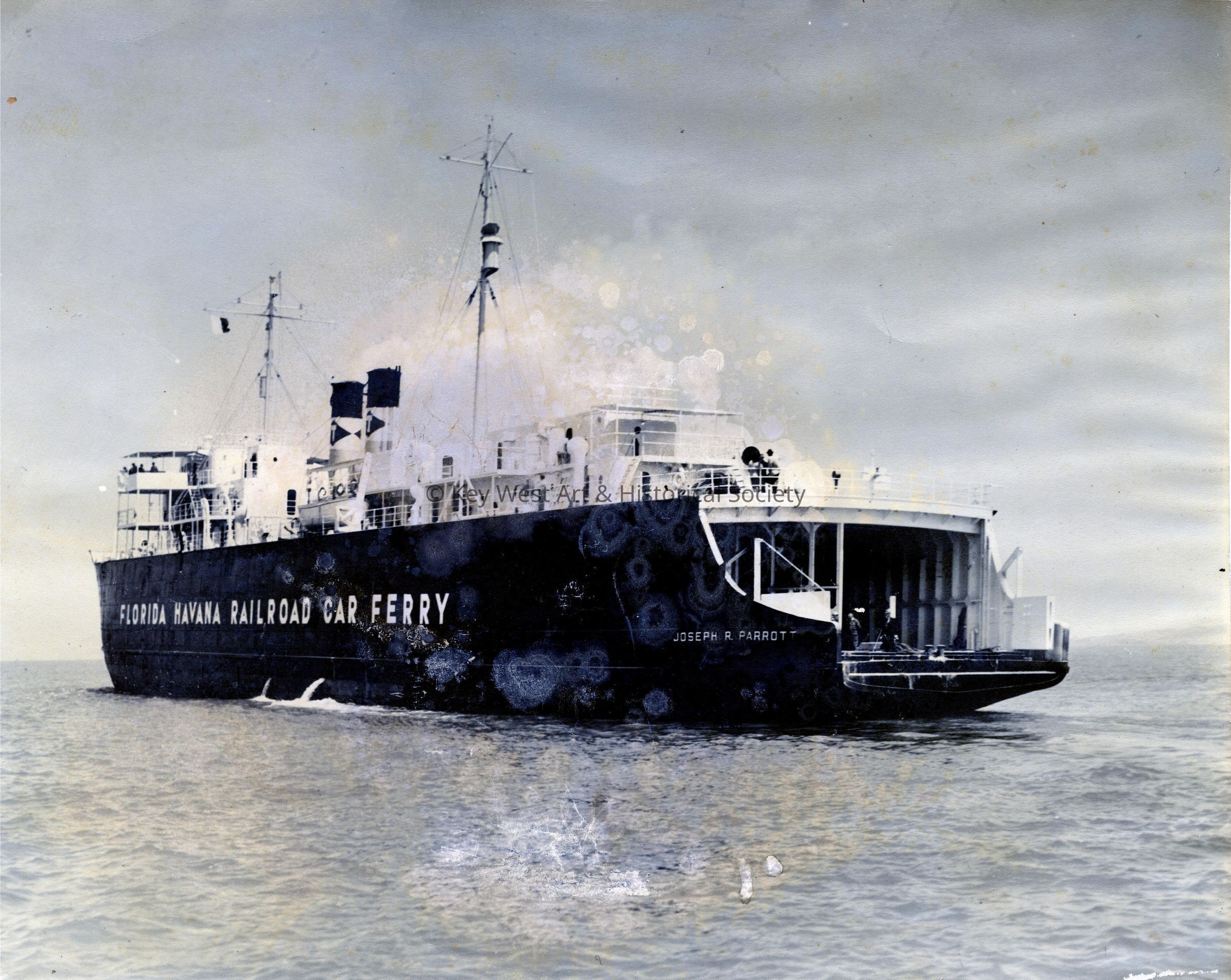 Black and white photograph of the Florida Havana Railroad Car Ferry 'Joseph R. Parrott'. The Florida East Coast Railway operated a total of three railroad ferry ships that could up to 30 full sized railroad cars each. The inside car deck was 360 feet long with four parallel tracks running the length. In addition to the 30 cars, the ferry had the capacity for 3,000 tons of dry cargo and 3,000 tons of bulk molasses in ballast tanks. This ferry was named in honor of Joseph R. Parrott, the Vice President of the Florida East Coast Railway system.Photograph Details