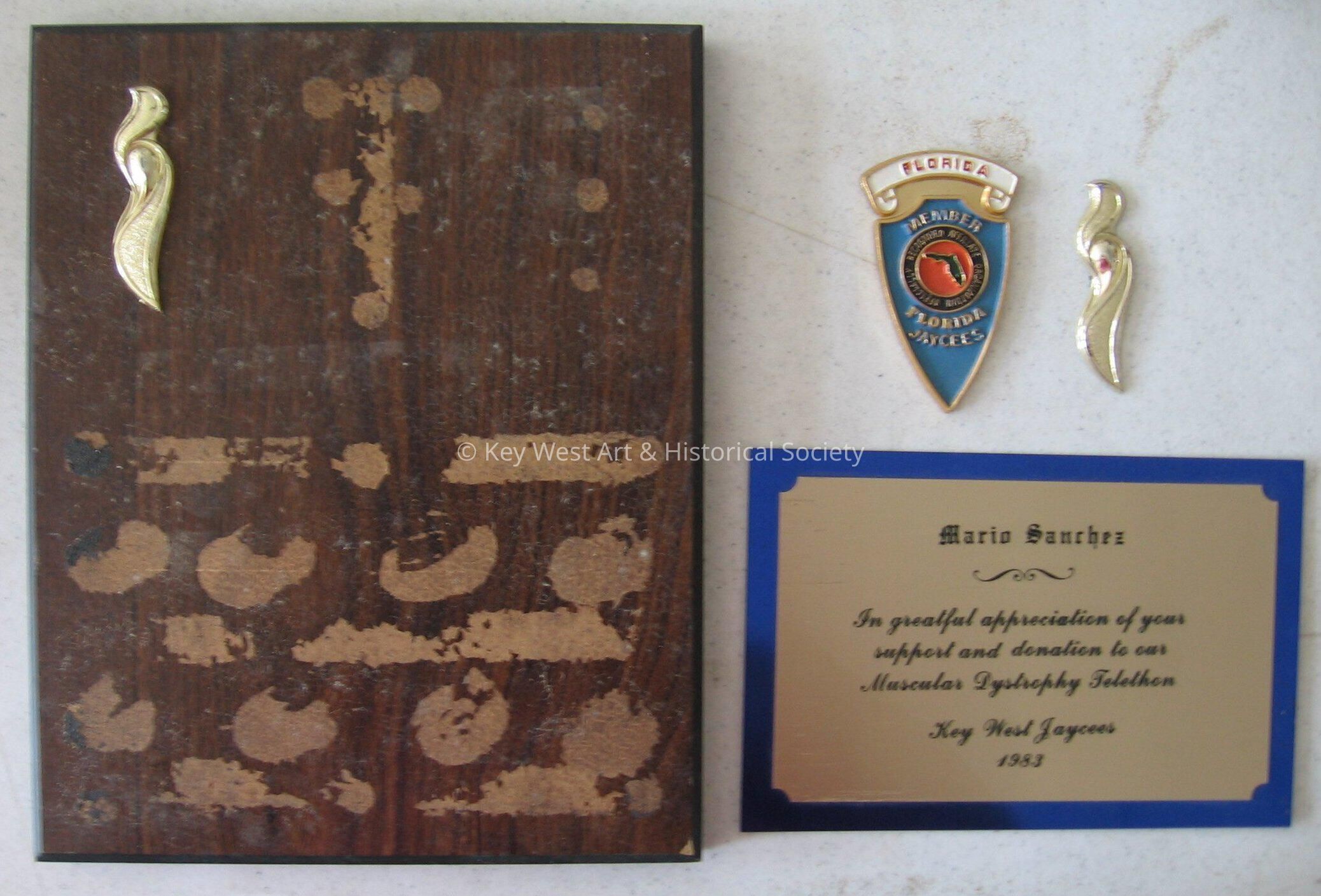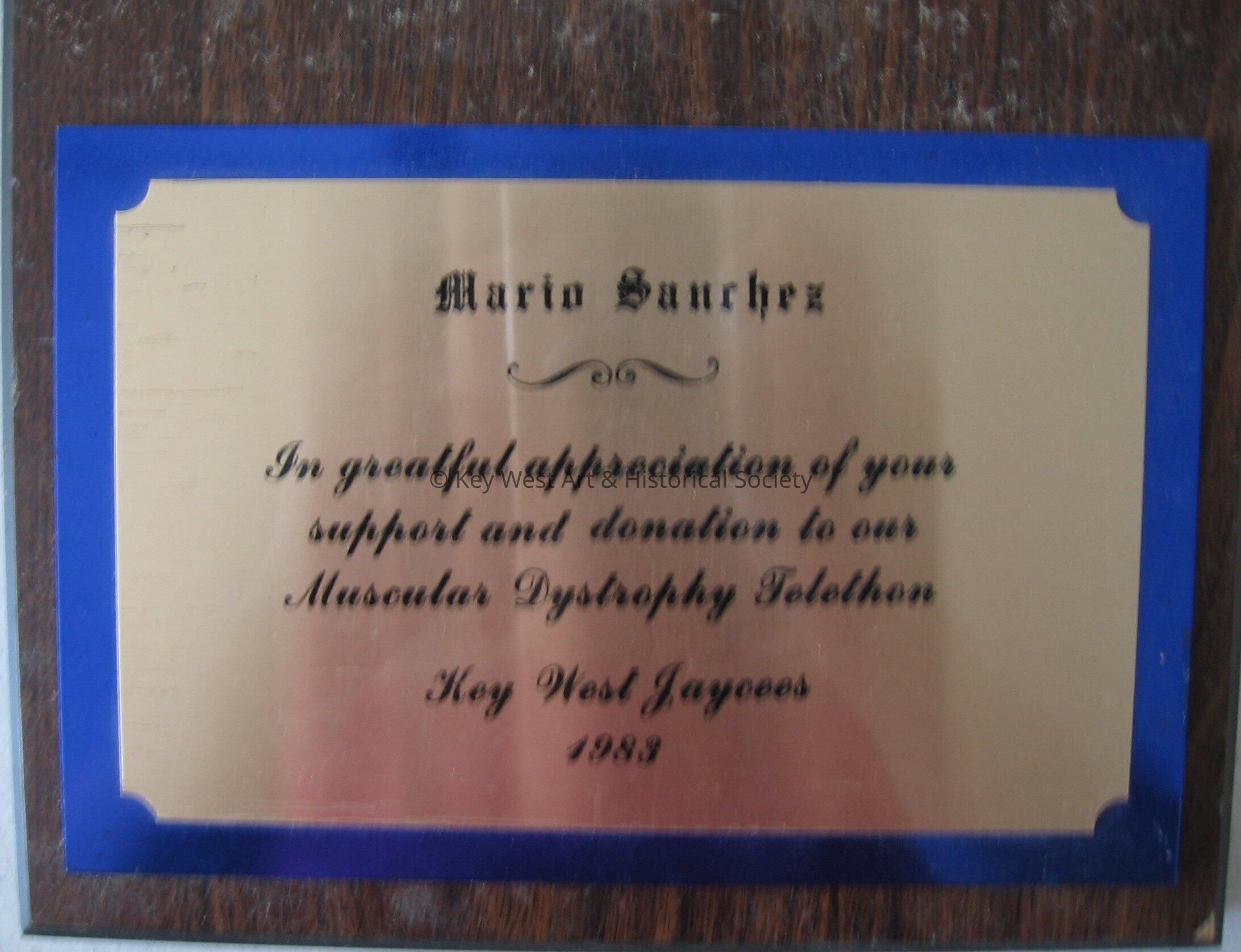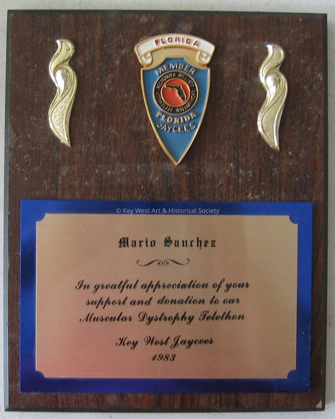 Plaque presented to Mario Sanchez from the JAYCEES in appreciation for his support and donation to the Muscular Dystrophy Telethon.Collection
