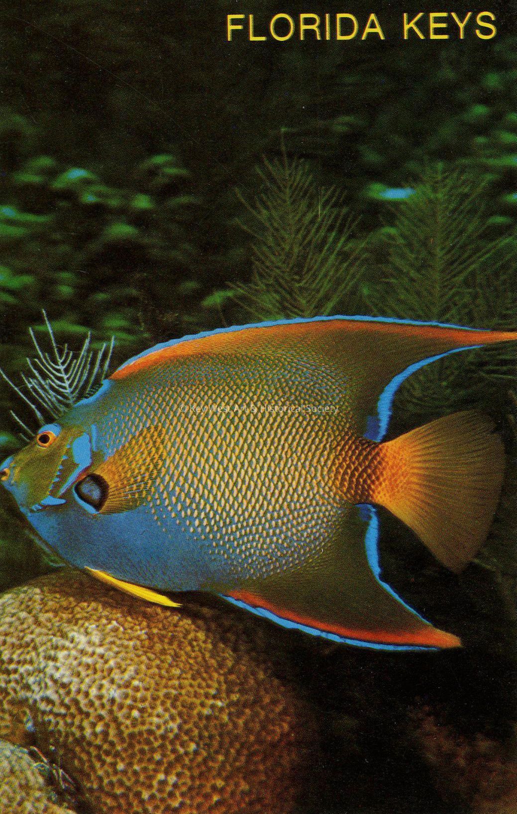 Color postcard depicting an angel fish. Notation on verso, 'Angel fish and reef formation, Coral Reef State Park, Key Largo, Florida.'Subject Place