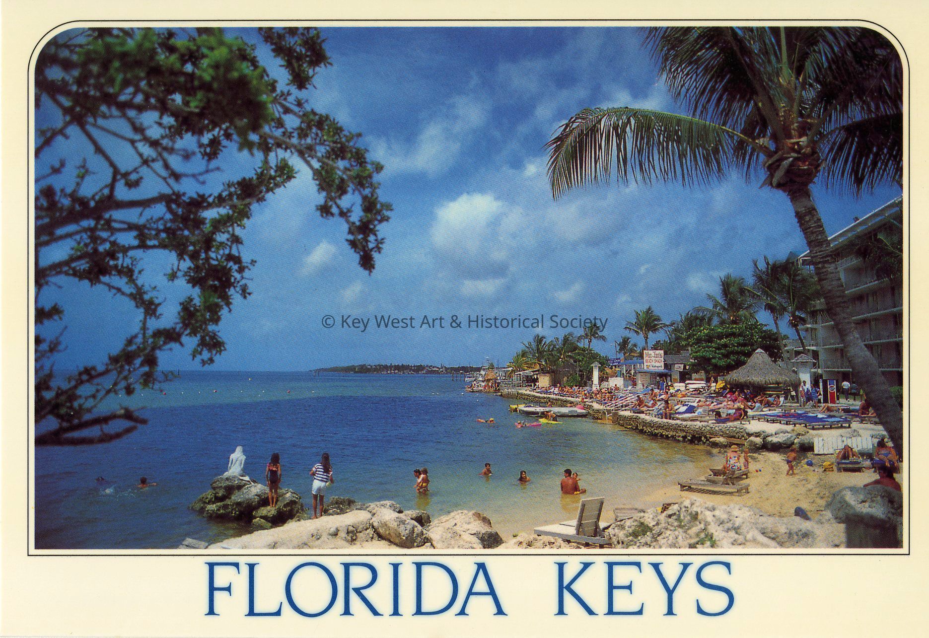 Postcard depicting an Islamorada beach with sunbathers and swimmers.