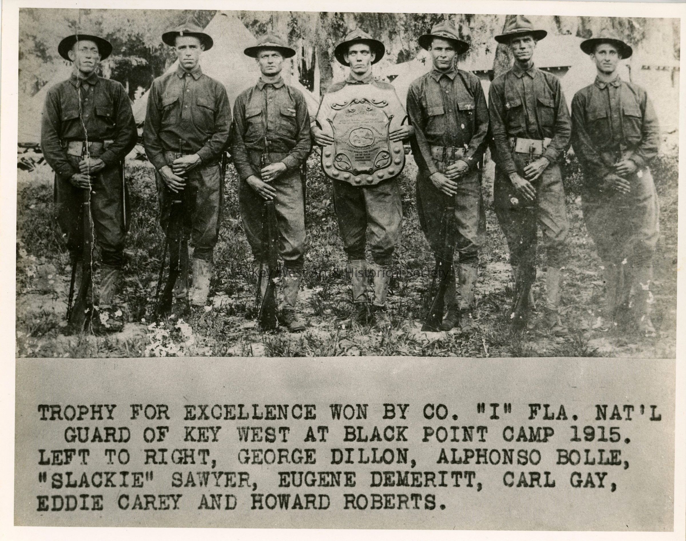 Black and white photograph of the Florida National Guard Company I of Key West posing after they won a trophy for excellence at Black Point Camp. Pictured (l-r) George Dillon, Alphonso Bolle, 'Slackie' Sawyer, Eugene Demeritt, Carl Gay, Eddie Carey and Howard Roberts.Photograph Details