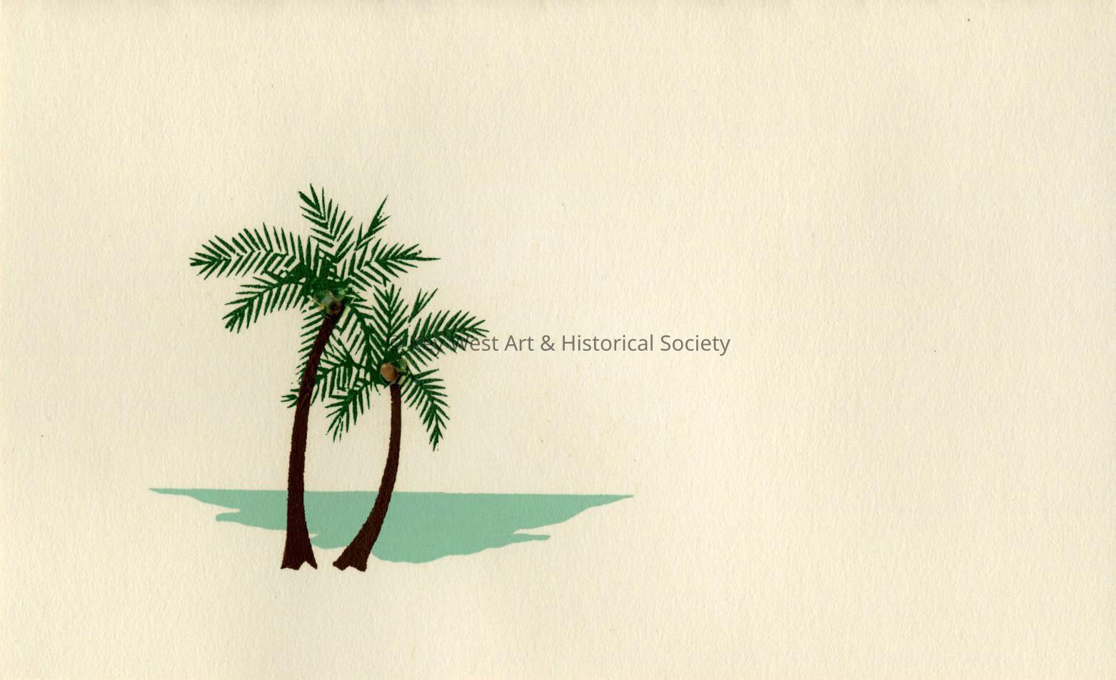 Paper notecard in a Florida motif depicting two palm trees. The notecard was hand printed with miniature shells.Collection