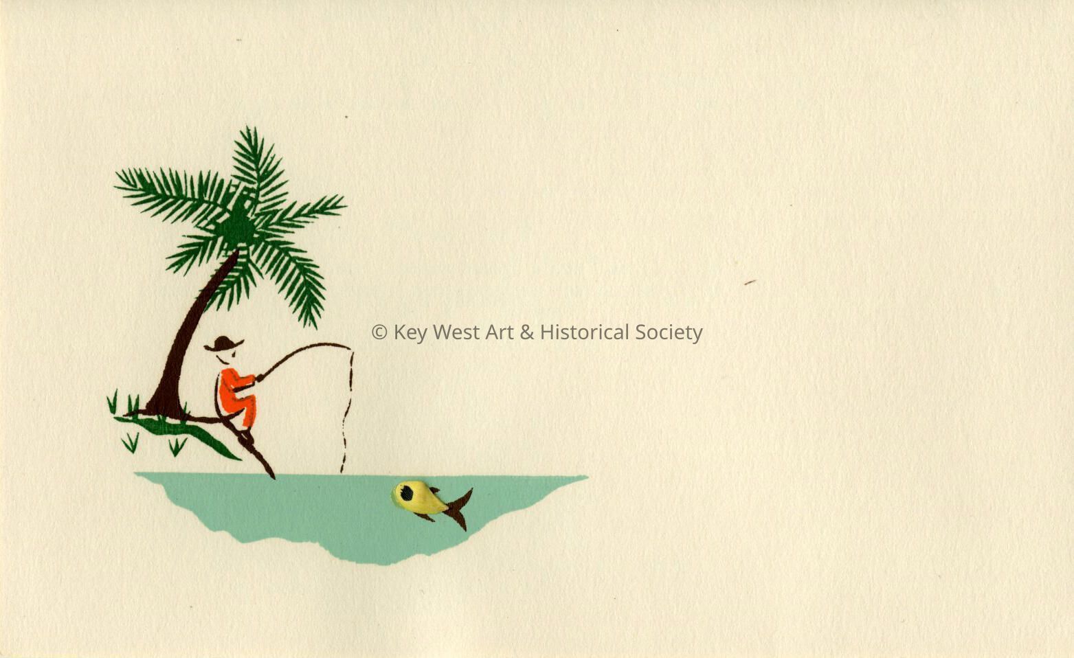 Paper notecard in a Florida motif depicting a man fishing under a palm tree. The notecard was hand printed and includes a miniature seashell.Collection