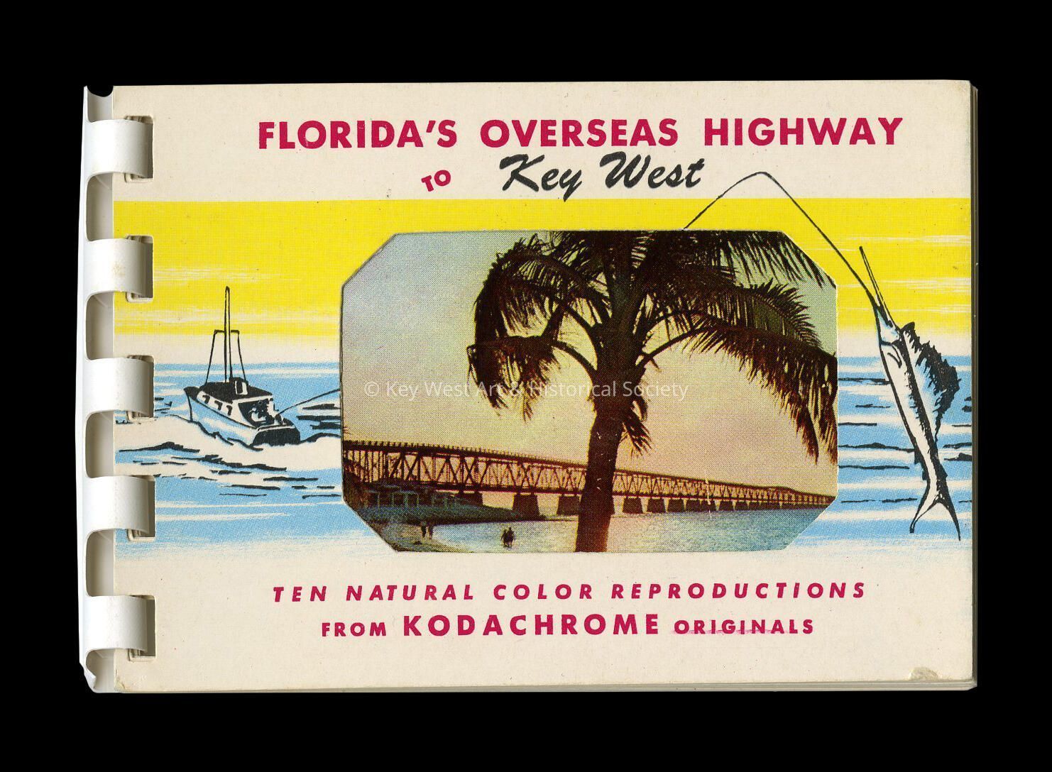 A small souvenir booklet entitled 'Florida's Overseas Highway to Key West - Ten Natural Color Reproductions from Kodachrome Originals'. Views of the Overseas Highway from Key Largo to Key West are included in the booklet. A few handwritten notes about the sites are included in the original owner's handwriting. Images are bound together by a plastic comb.Collection
