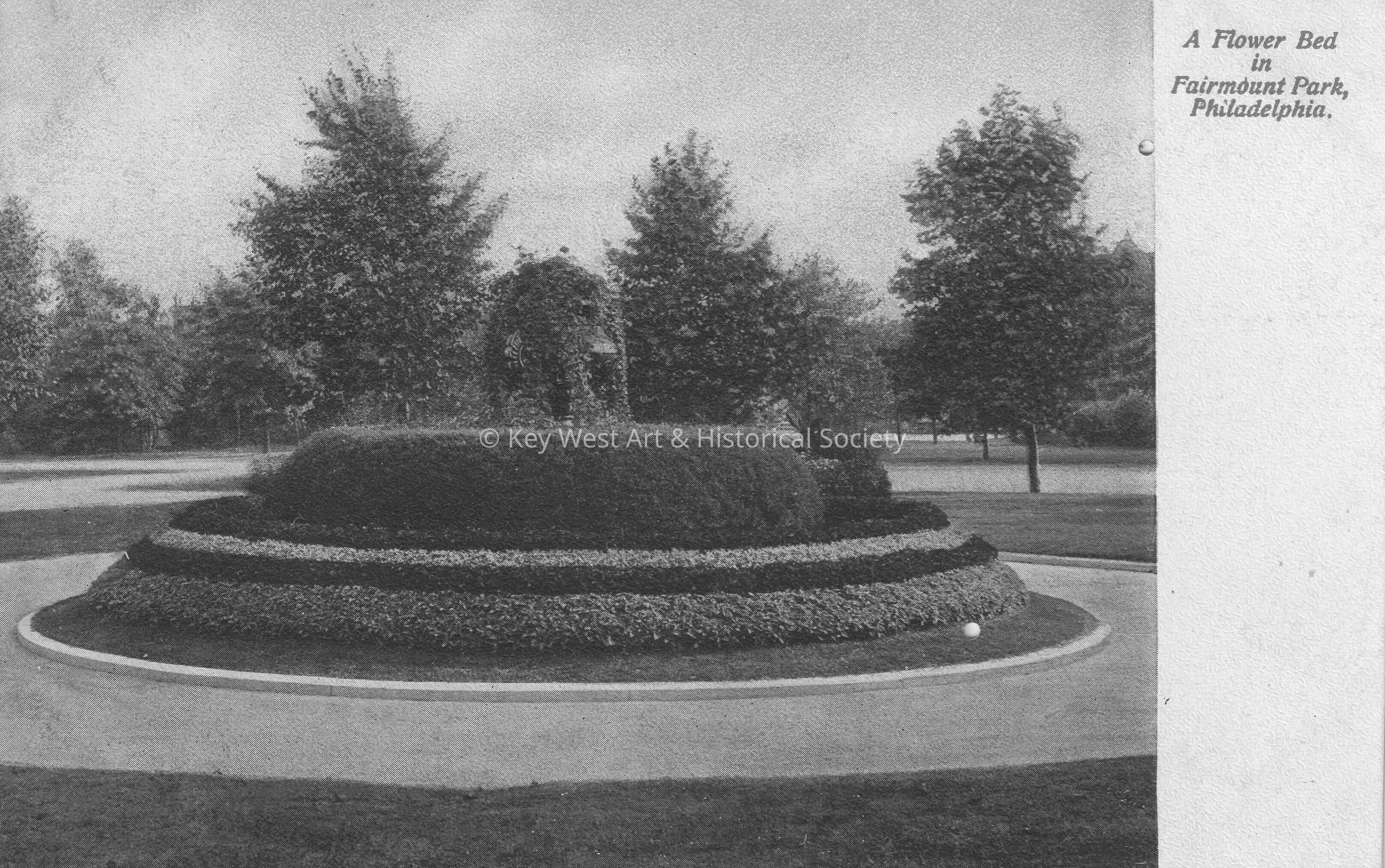 Postcard depicting a round flower bed and hedges. The caption reads, ‘A Flower Bed in Fairmount Park, Philadelphia.’Collection