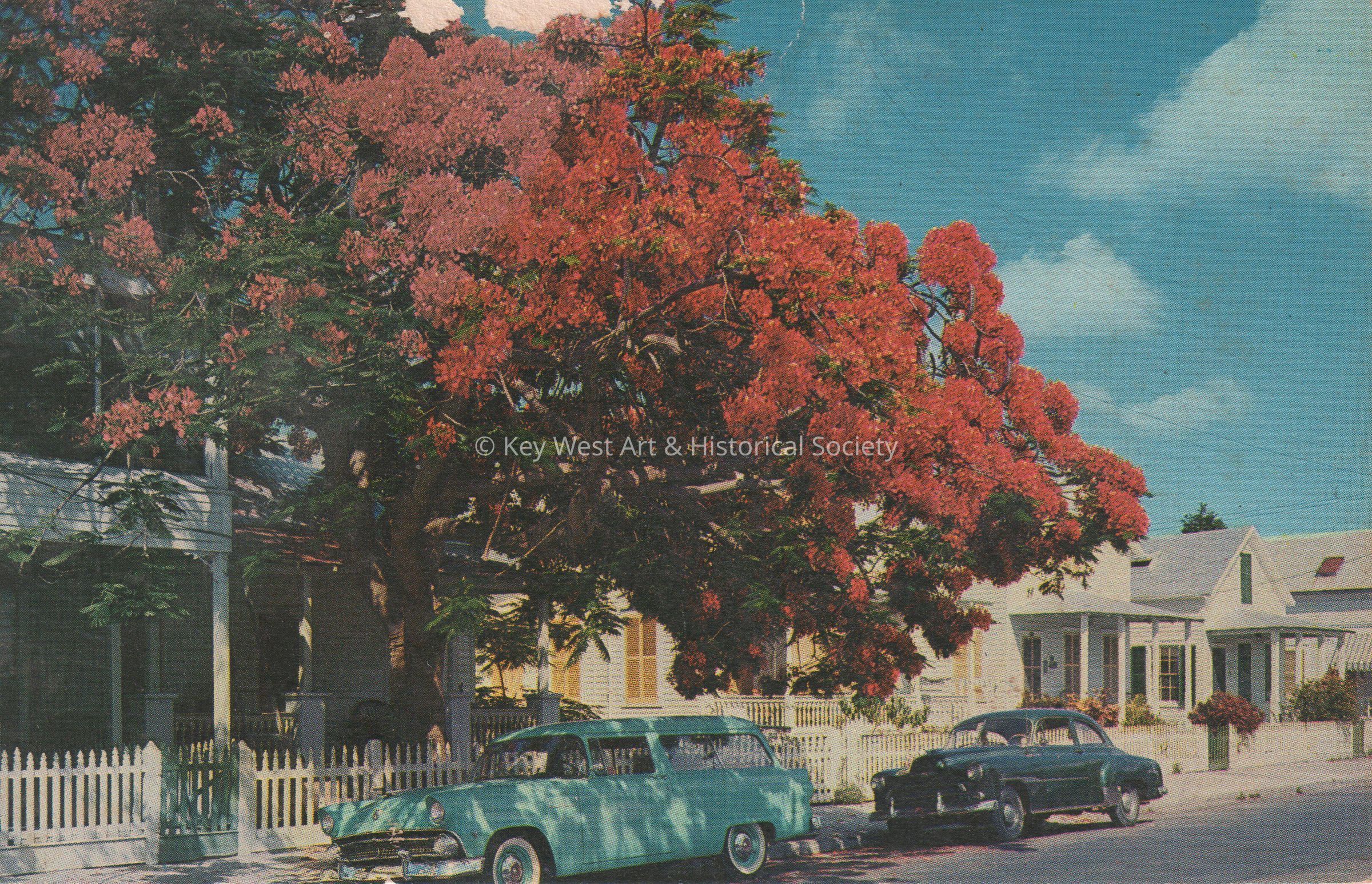 Postcard depicting a flowering tree, cars, and houses. The description on the verso reads, ‘Flowering Royal Poinciana Tree, Key West, Florida.’Collection