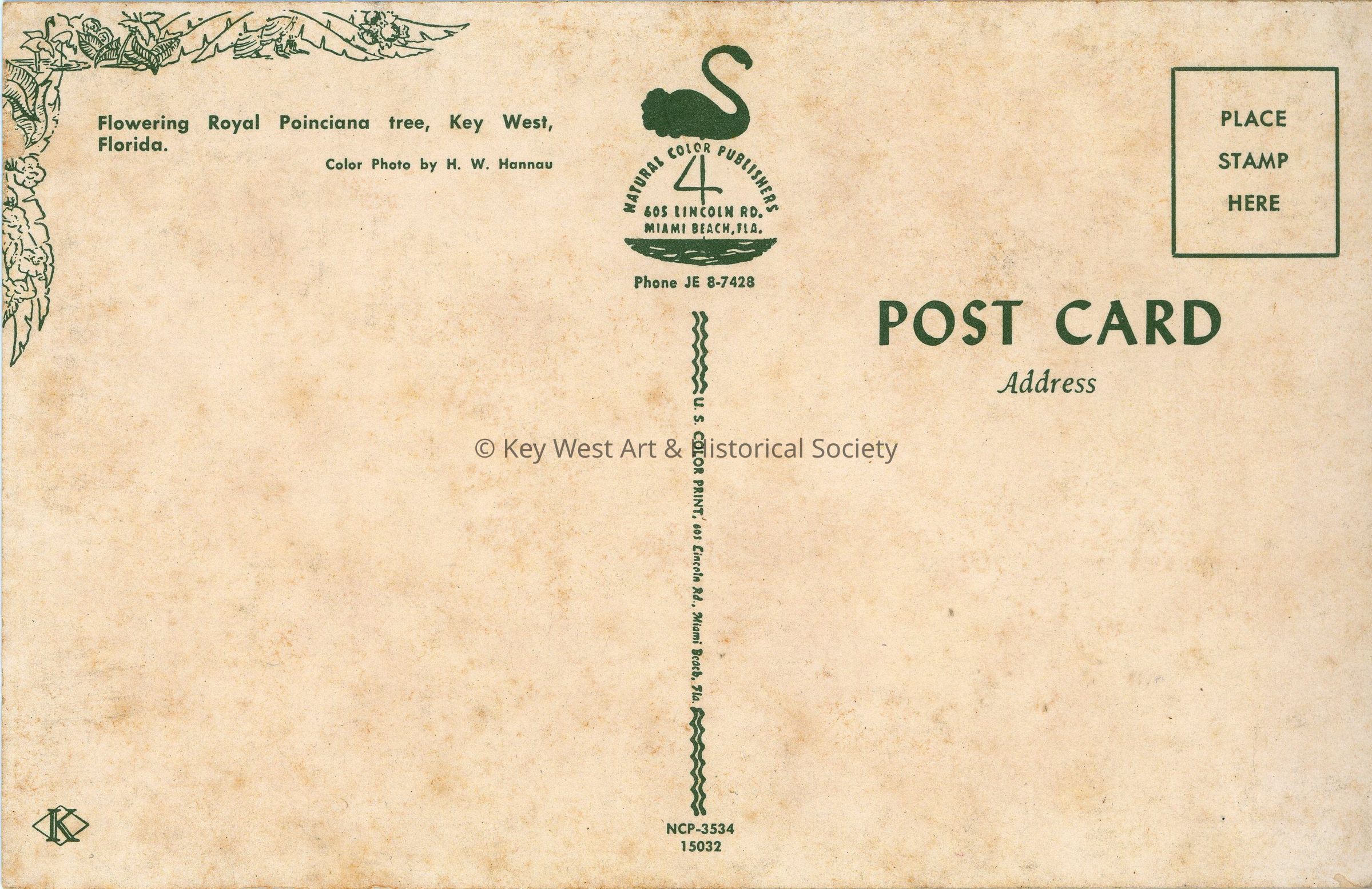 Postcard depicting a heavily blooming Royal Poinciana tree overhanging and unknown street.Subject Place