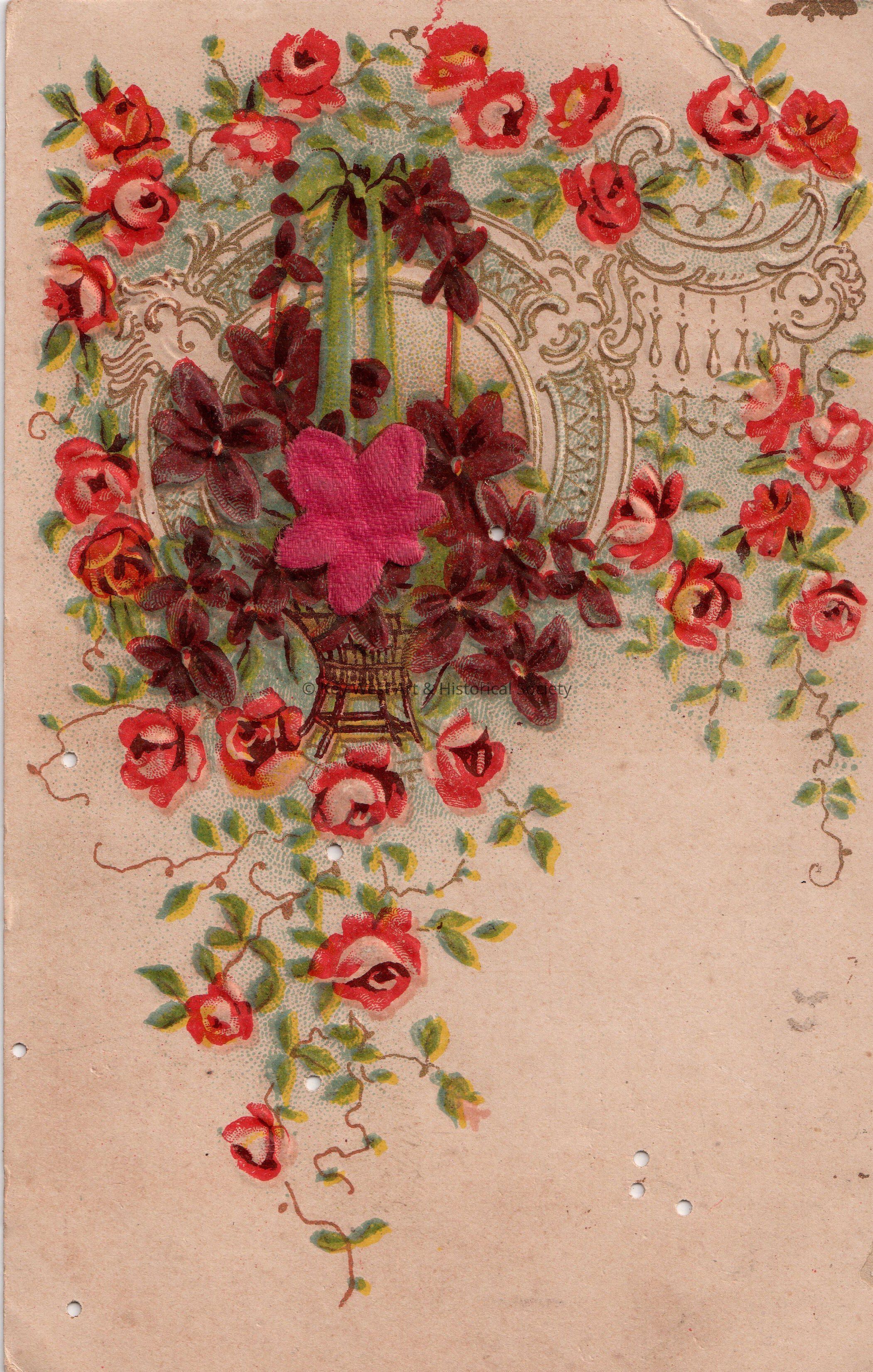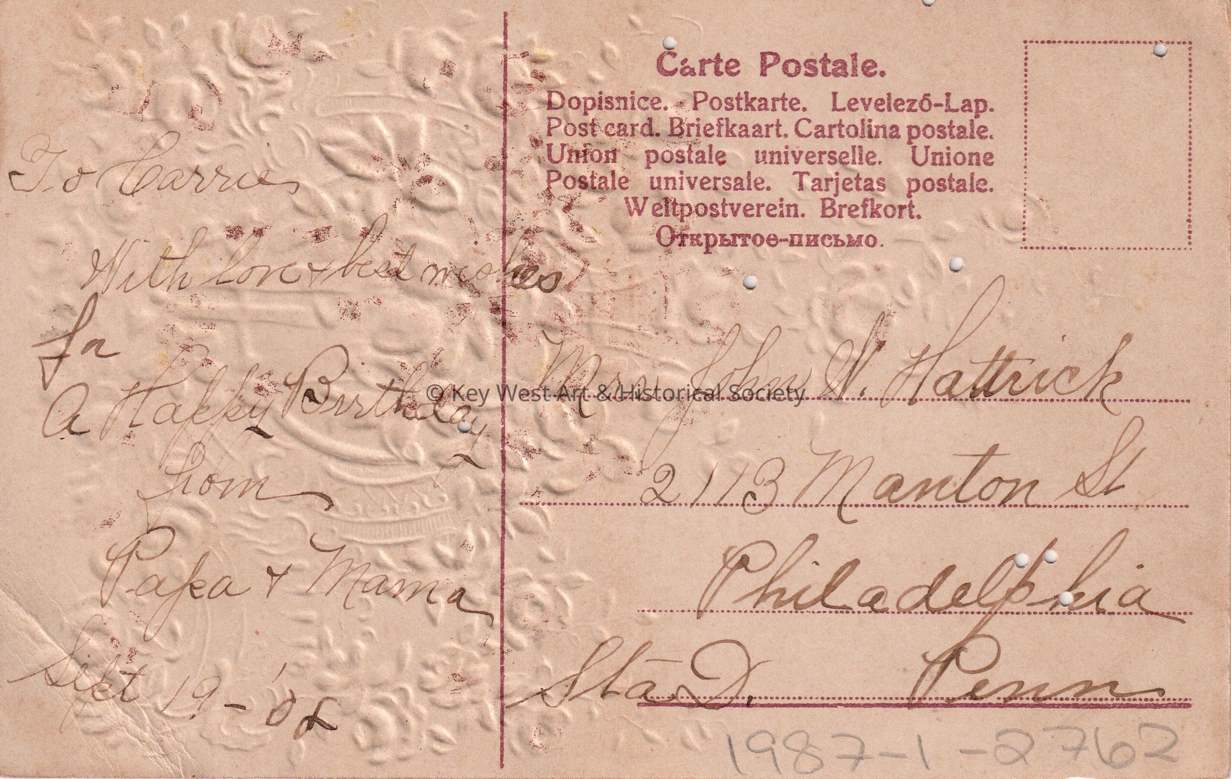 Postcard depicting flowers. The message on the verso reads, ‘To Carrie, With love & best wishes for a Happy Birthday, from Papa & Mama, September 19, 1908.’ The card is addressed to Mrs. John Hattrick, 2113 Manton Street, Philadelphia, Pennsylvania, Station D.Collection