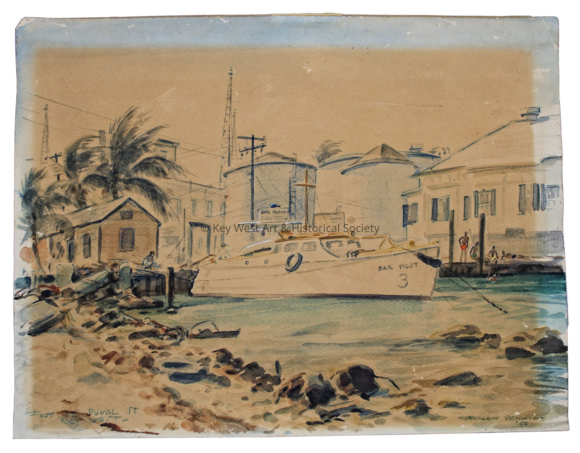 Watercolor by Morgan Dennis depicting the foot of Duval Street at the Gulf of Mexico. Shown is a docked boat named BAR PILOT 3 and a sign behind it reading 'Glass Bottom Sight Seeing.'Artwork Details