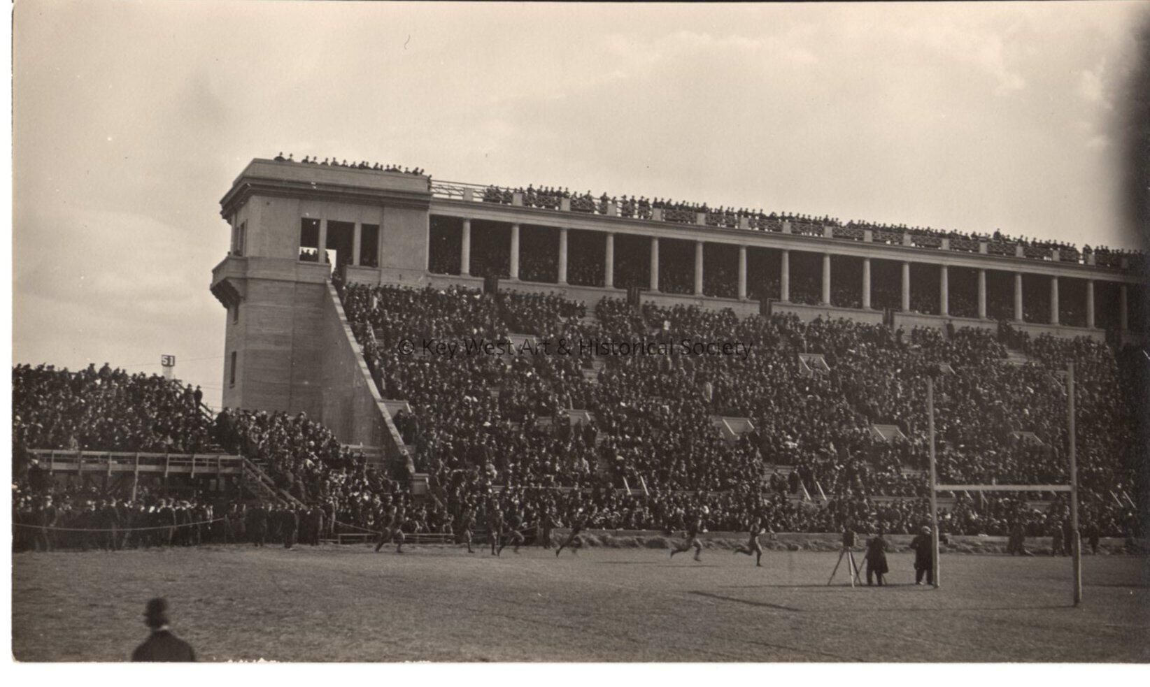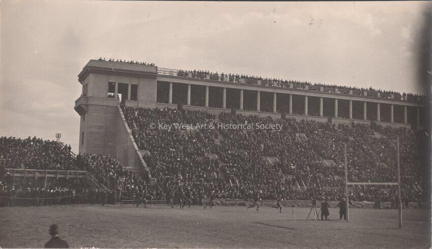 Black and white photo showing the stadium stands at the Harvard Yale football game.Collection