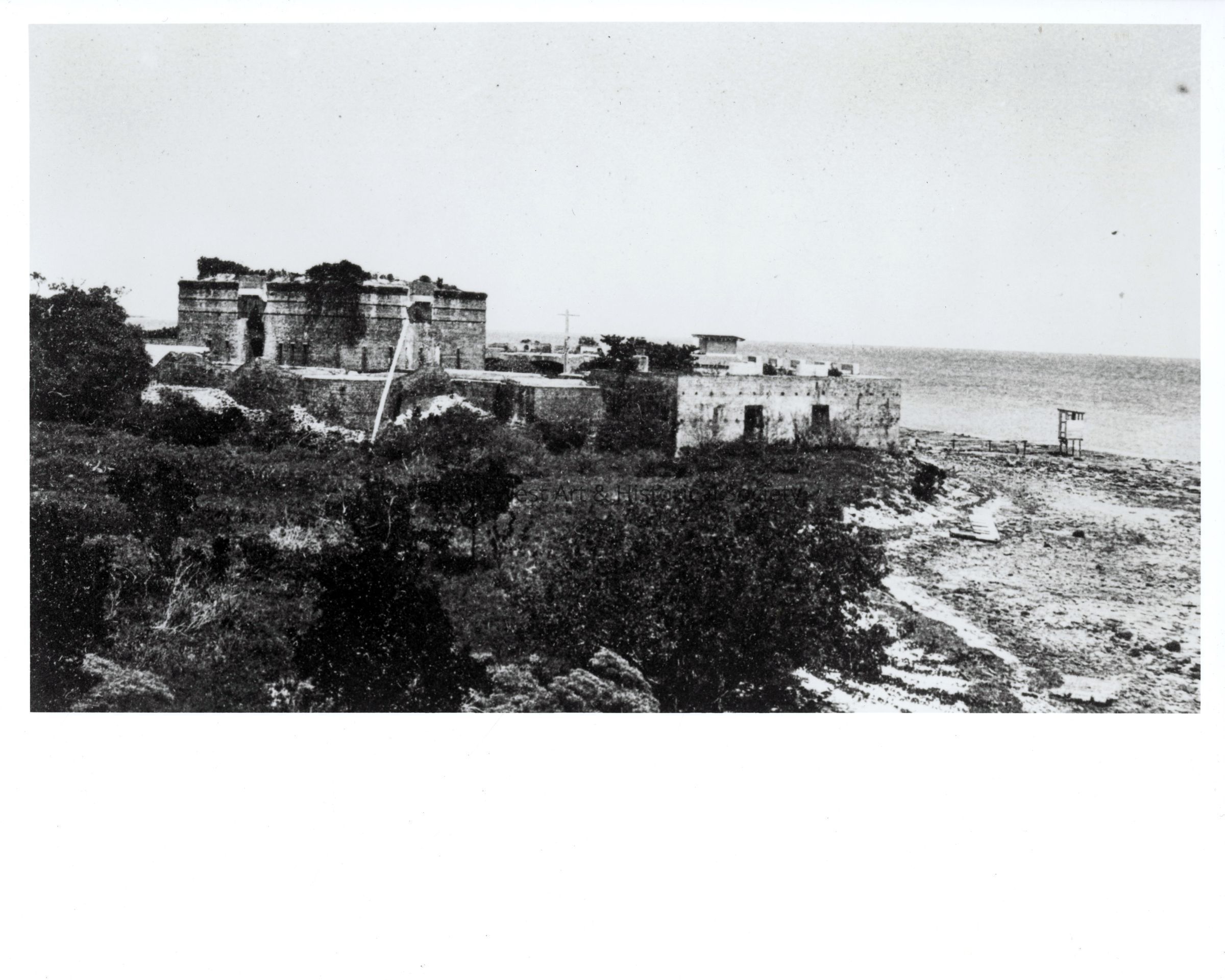 Black and white photograph of Fort East Martello tower before the construction of South Roosevelt Boulevard. The outhouse is visible on the right.
