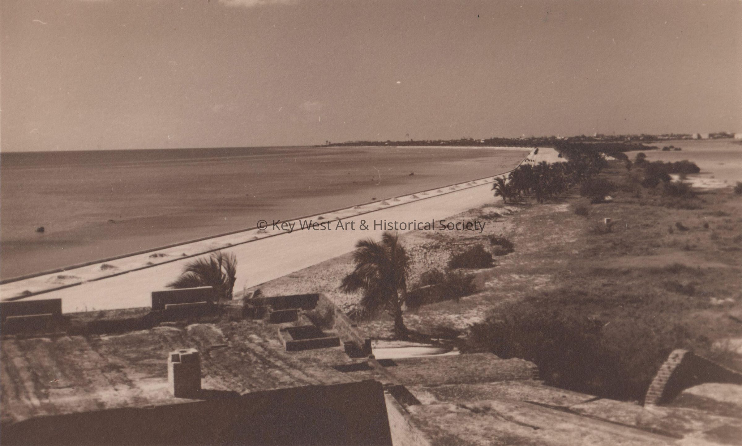 Postcard of Fort East Martello citadel tower and salt ponds along South Roosevelt Boulevard during World War II.