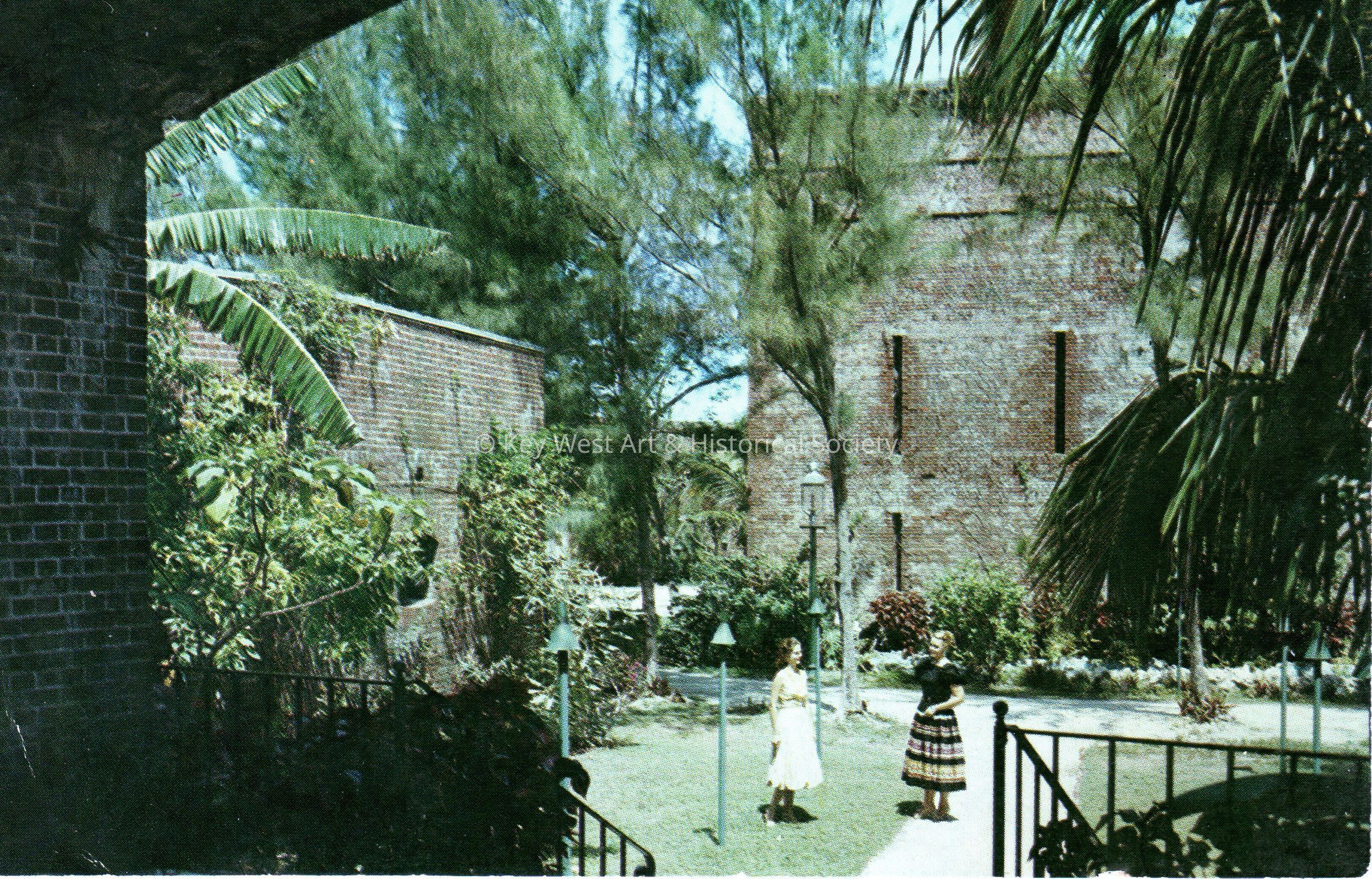 Postcard depicting two women in the courtyard of Fort East Martello. The description on the verso reads, 'View of tropical garden, Civil War Citadel and Fort Martello Gallery and Museum, Key West, Florida.'Subject Place