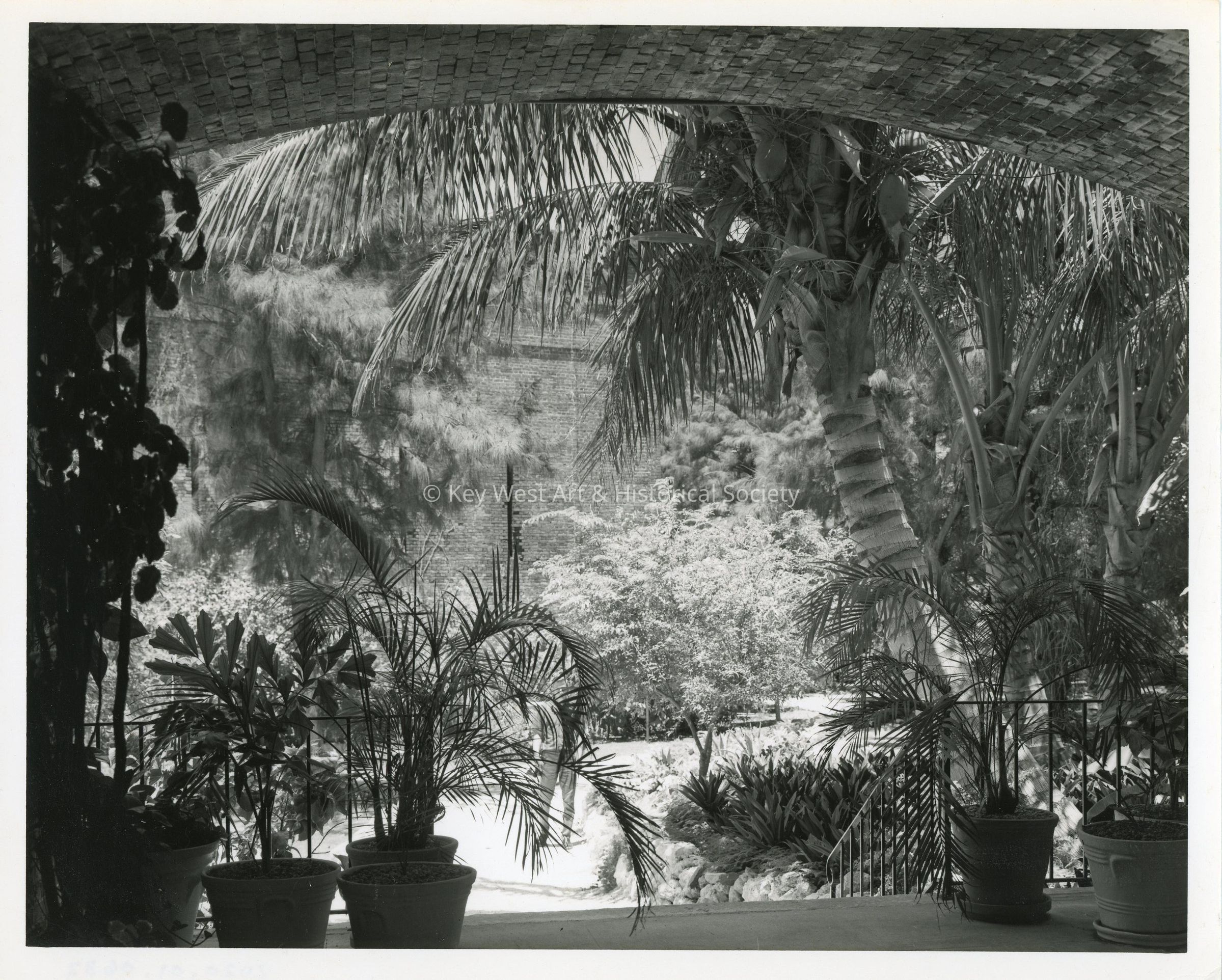 Black and white photograph taken from just inside the main entrance of Fort East Martello, looking out into the courtyard toward the citadel.