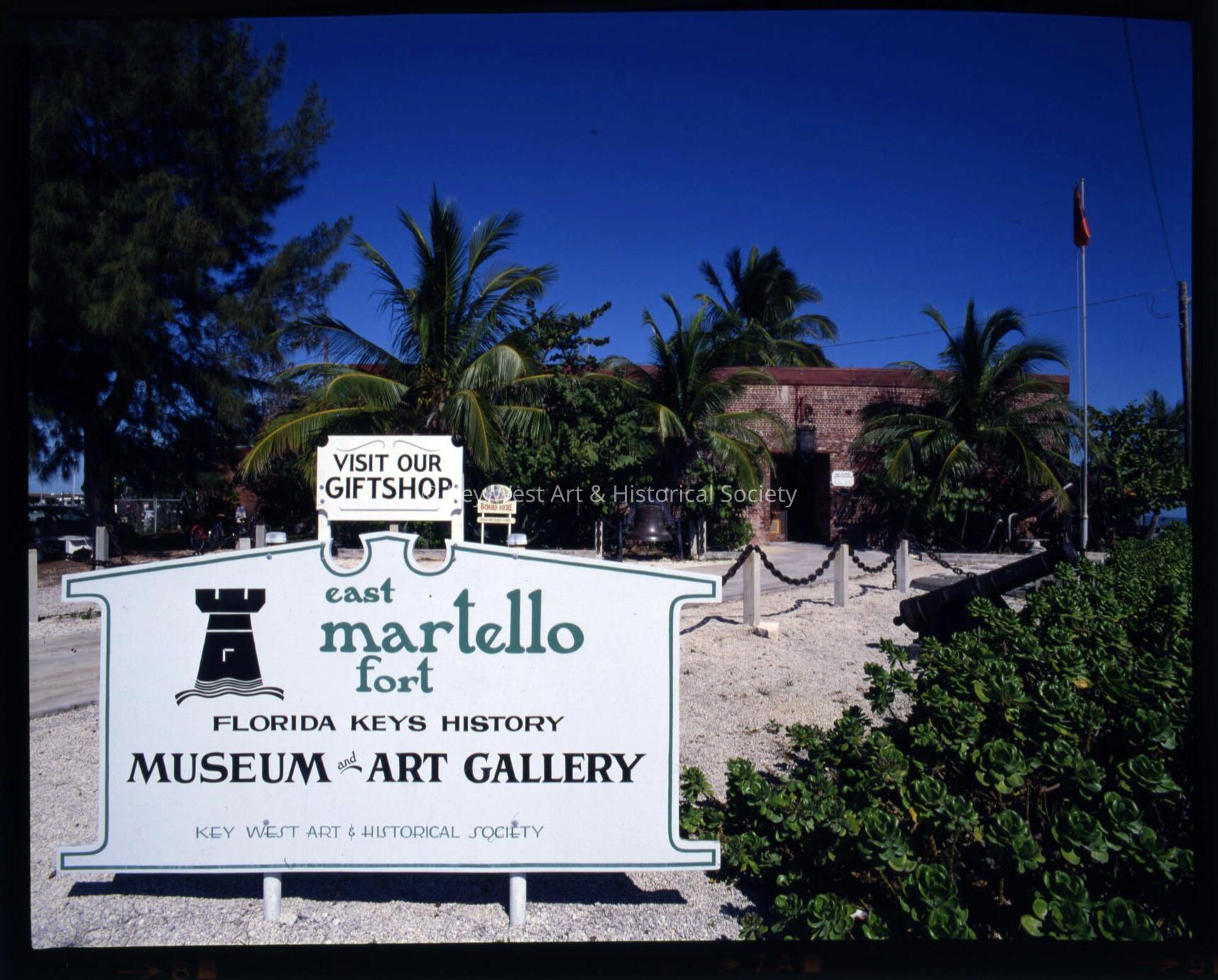 Color negative of the sign at the entrance to Fort East Martello Museum.