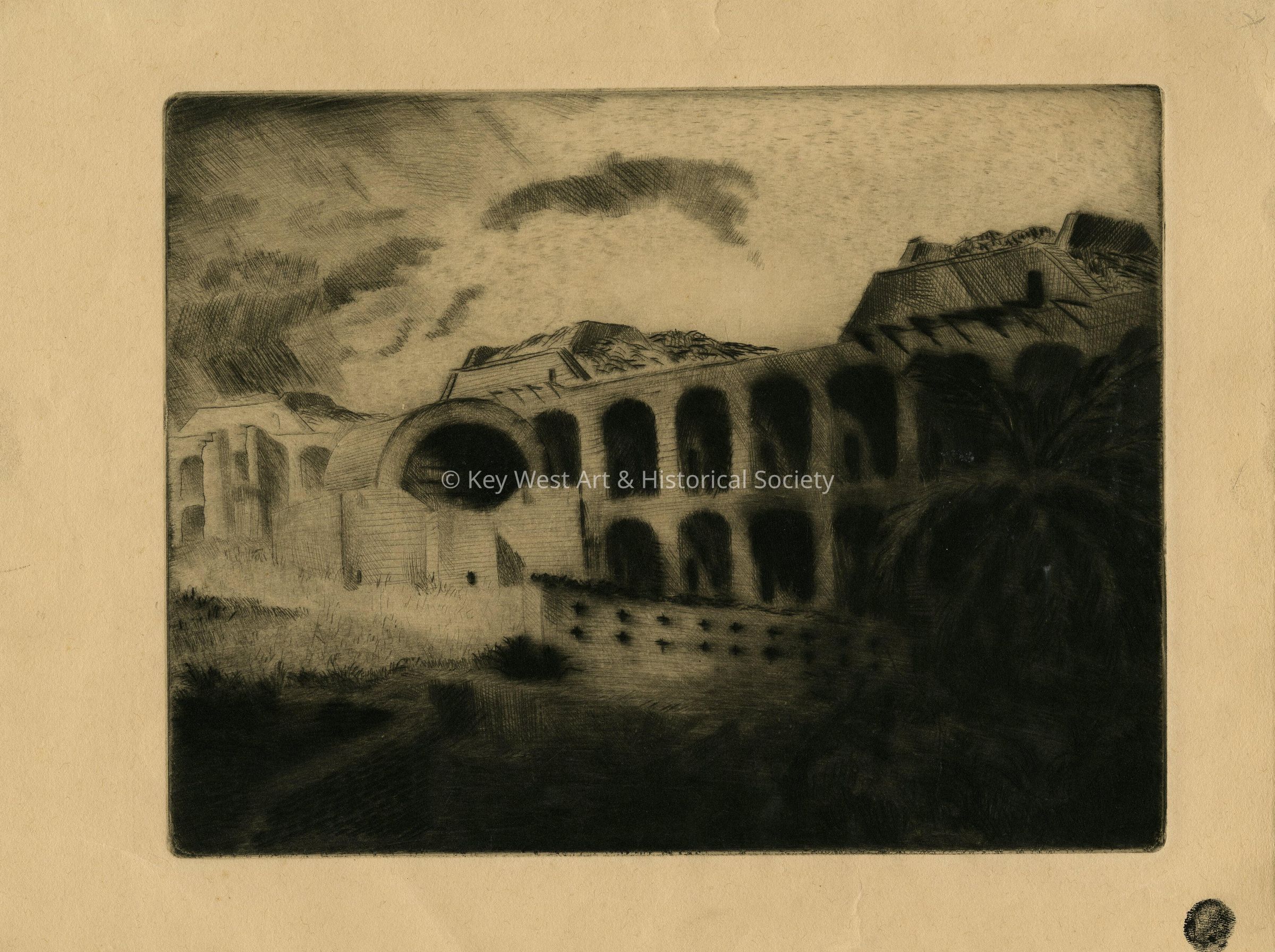 Etching by Stanley Wood of the large magazine and hot shot furnace in the parade ground at Fort Jefferson in the Dry Tortugas.