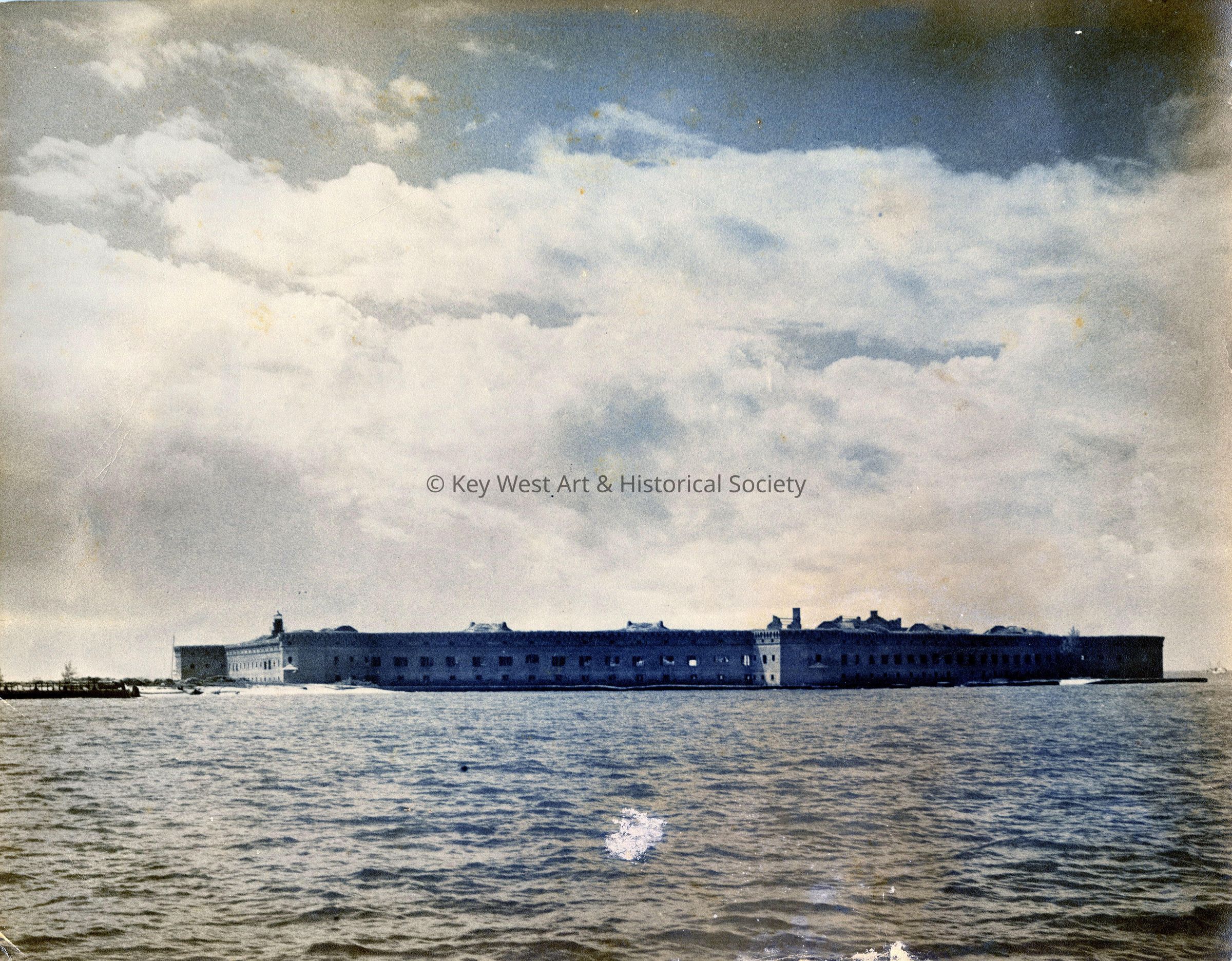 Black and white photograph of Fort Jefferson in the Dry Tortugas approaching the fort from the water.