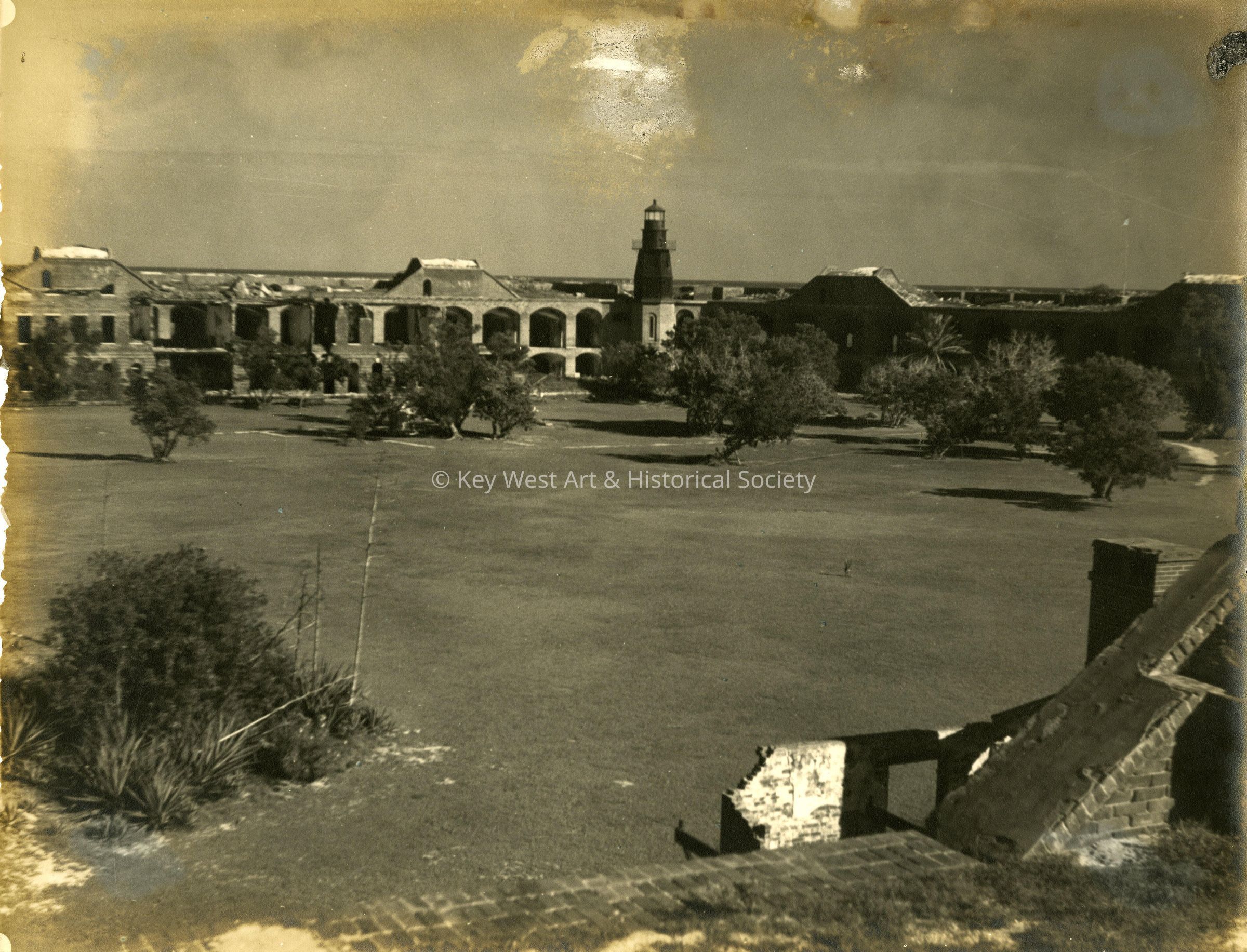 Black and white photograph of Fort Jefferson, Garden Key Lighthouse and parade grounds.