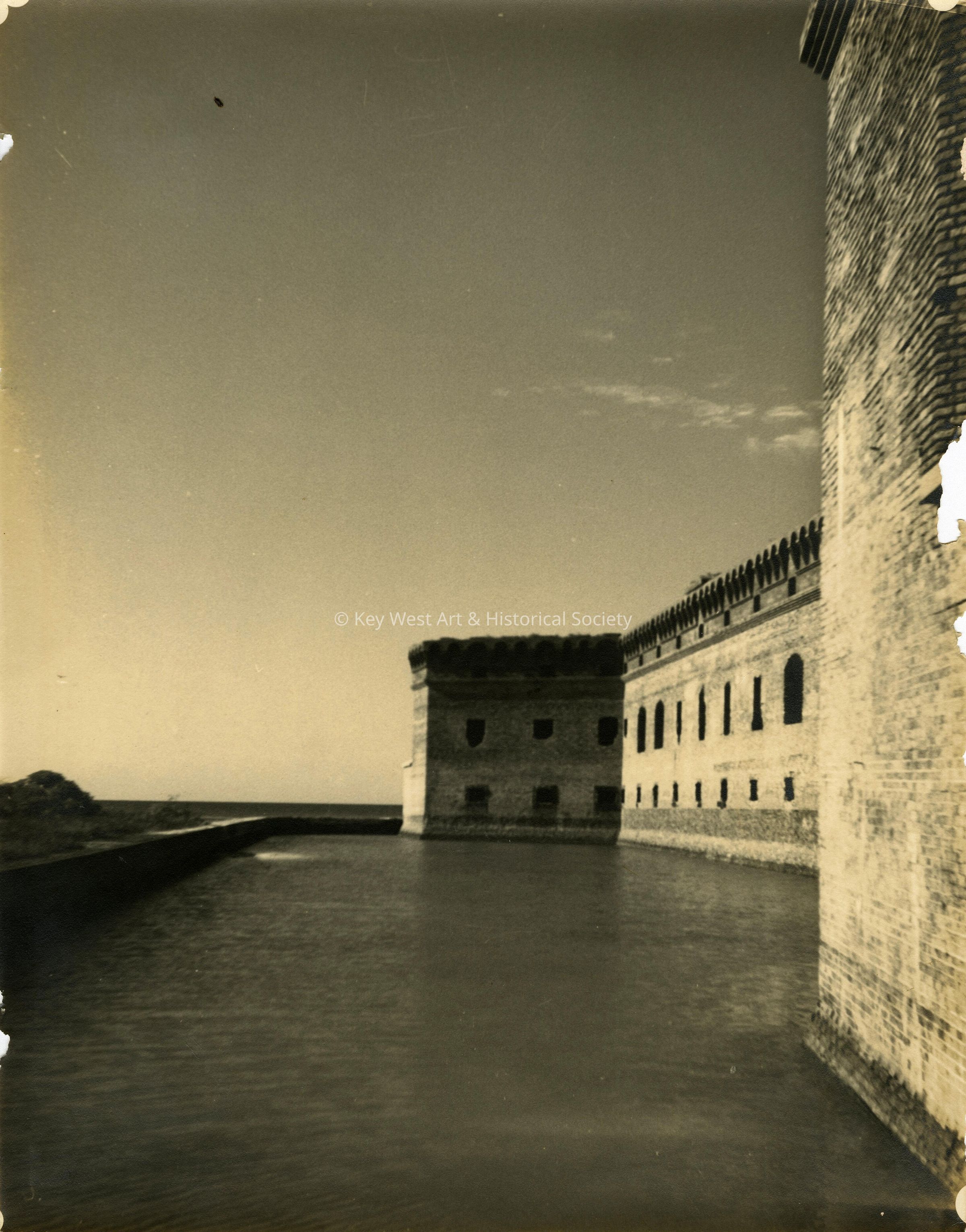 Black and white photograph of the moat and outer wall of Fort Jefferson in the Dry Tortugas.