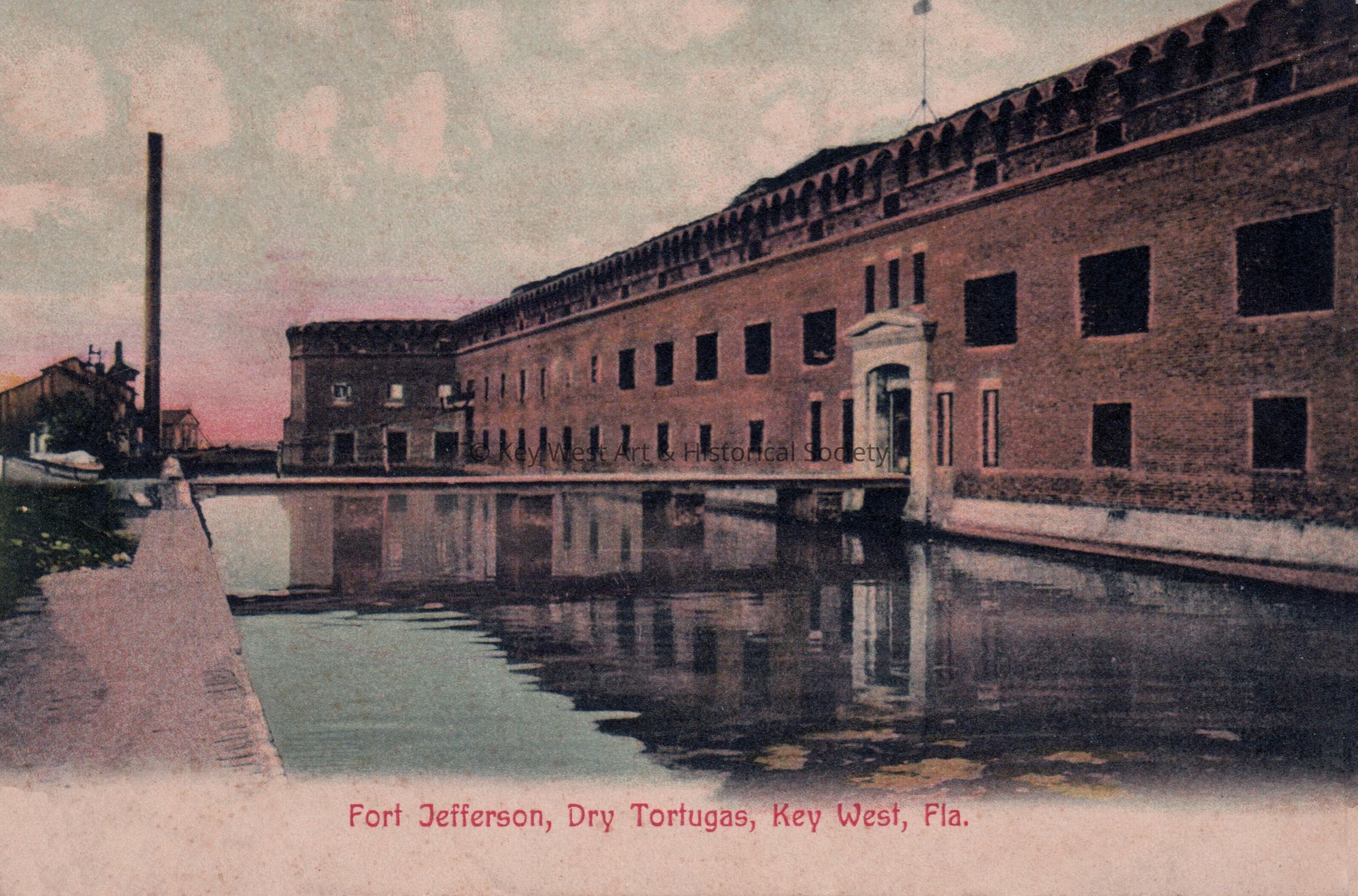 Postcard depicting a moat around a brick fort. The caption reads, ‘Fort Jefferson, Dry Tortugas, Key West, Florida’. A note on the verso reads, 'Where Dr. Mudd was.'Collection