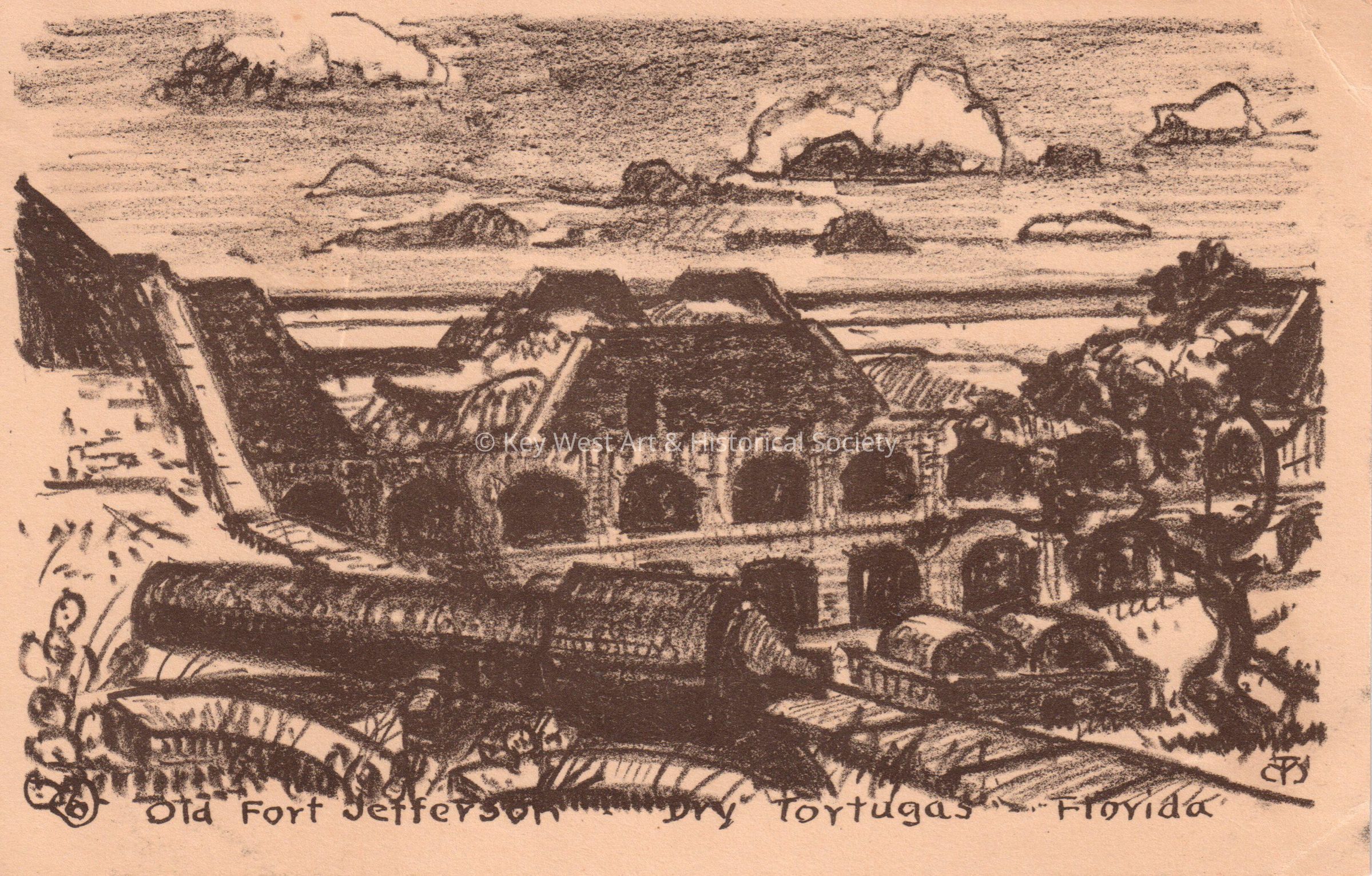 Postcard depicting a sketch of a brick fort. The caption reads, ‘Old Fort Jefferson, Dry Tortugas, Florida’.Collection
