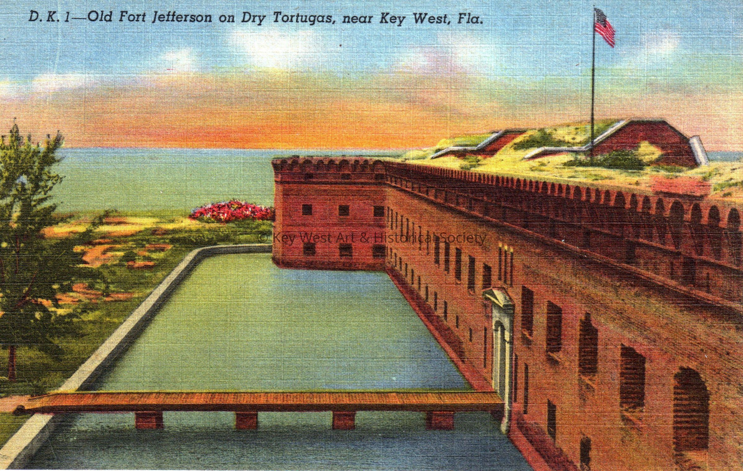 Postcard depicting a moat around Fort Jefferson in the Dry Tortugas. The caption reads, ‘Old Fort Jefferson on Dry Tortugas, near Key West, Florida’. The description on the verso reads, 'This old Citadel, now Fort Jefferson National Monument, was a formidable coastal defense about the time of the American Civil War. Following termination of hostilities the Fortress was used as a Federal Prison and became known as the American Devil's Island. Here Dr. Samuel Mudd of Maryland was imprisoned for giving medical aid to John Wilkes Booth, assassin of President Lincoln.'Collection